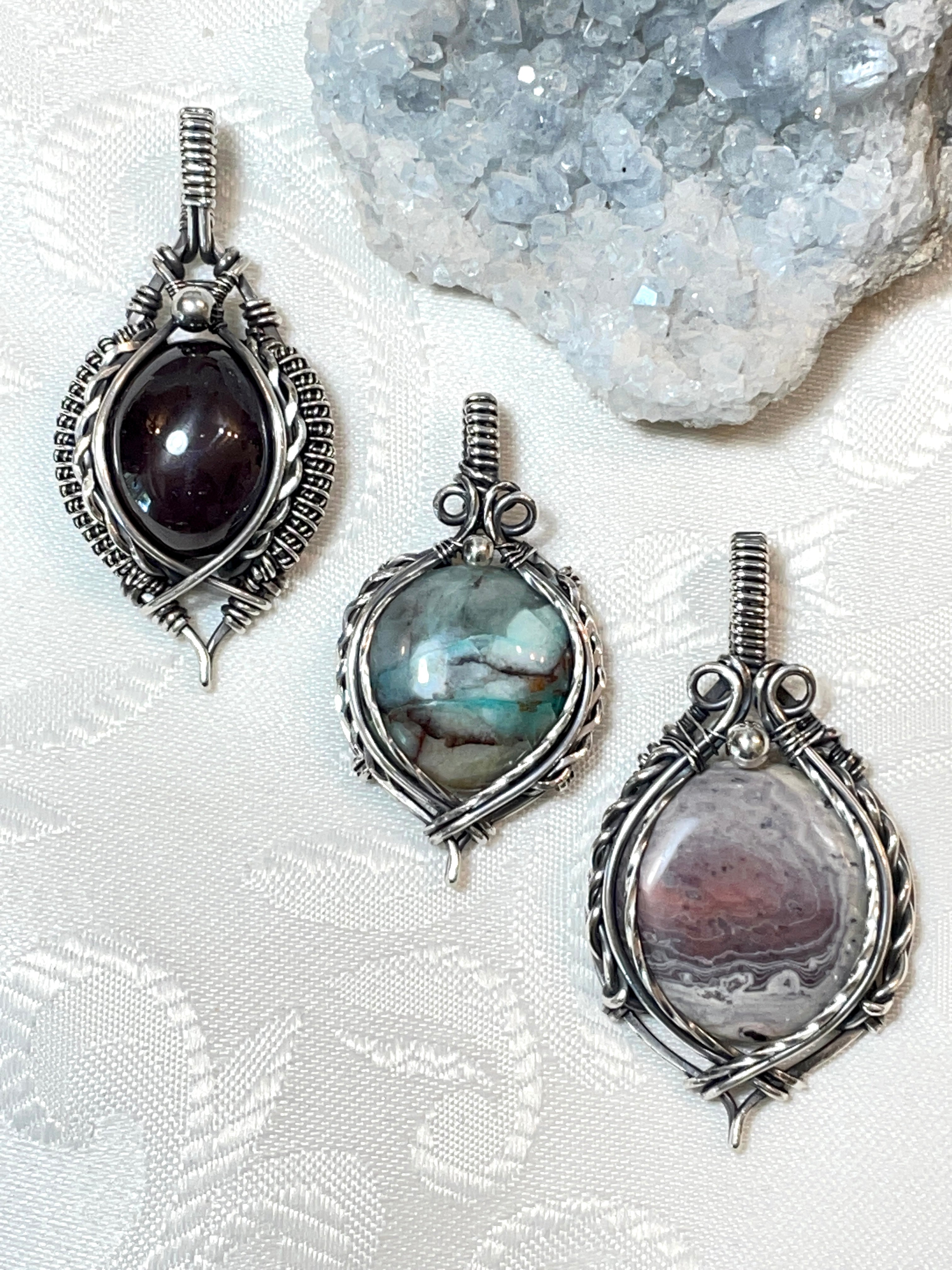 My name is Shelley Sullivan and I am a lapidary artist, wire wrapper and Metalsmith offering hand cut and polished semi-precious stone jewelry. Specializing in Sterling Silver and Copper wire wrapped, forged and smithed one of a kind pieces. I have been cutting stones since 2009 and working with various metals and creating this type of jewelry since 2010. Thank you for stopping by! Bless, Shelley