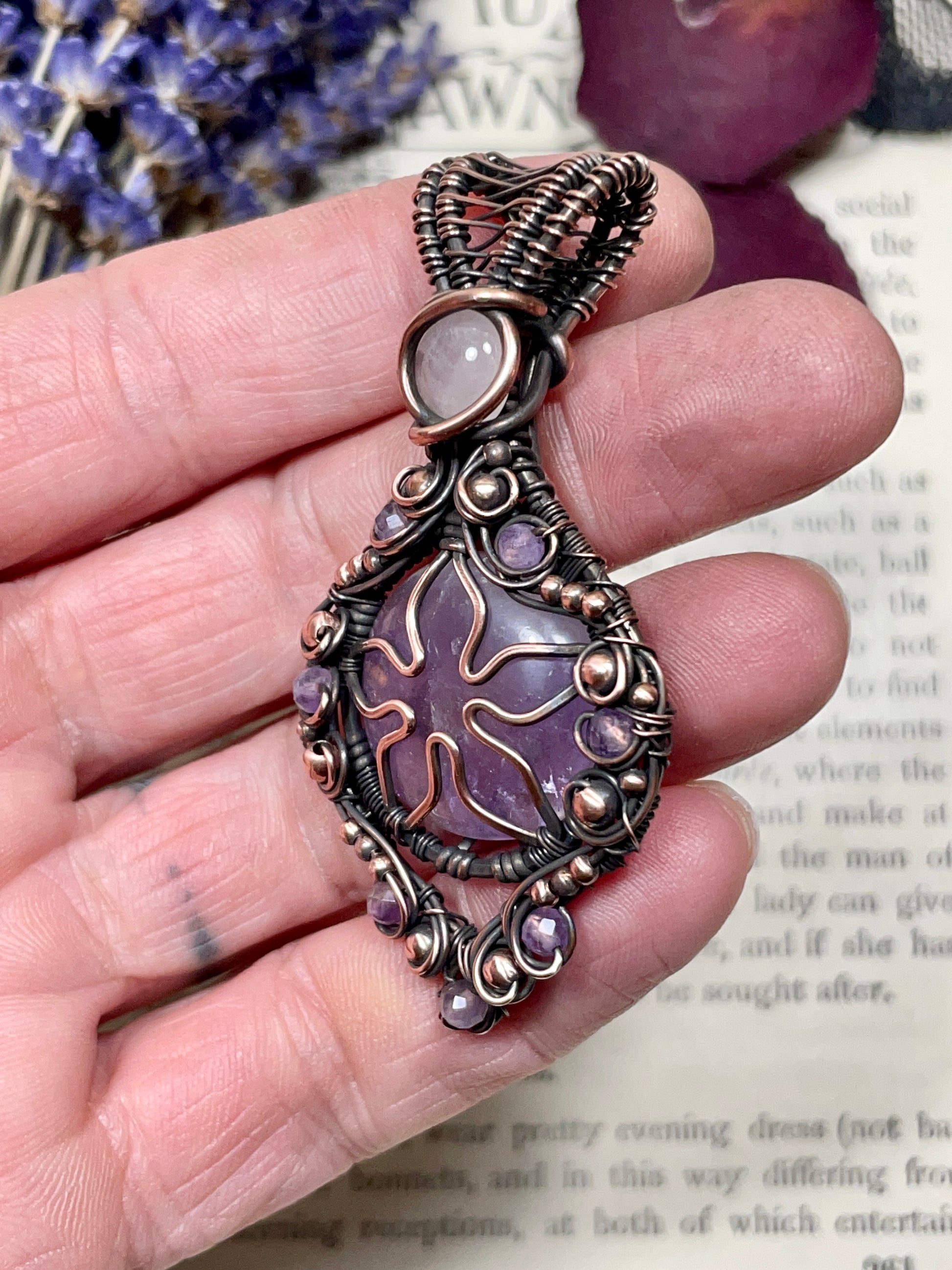 I have hand cut and wrapped this beautiful Ontario Amethyst Cabochon in bare copper and then added a flower to the front and topped it with a smaller rose quartz cabochon. I then embellished it with copper and faceted amethyst beads.