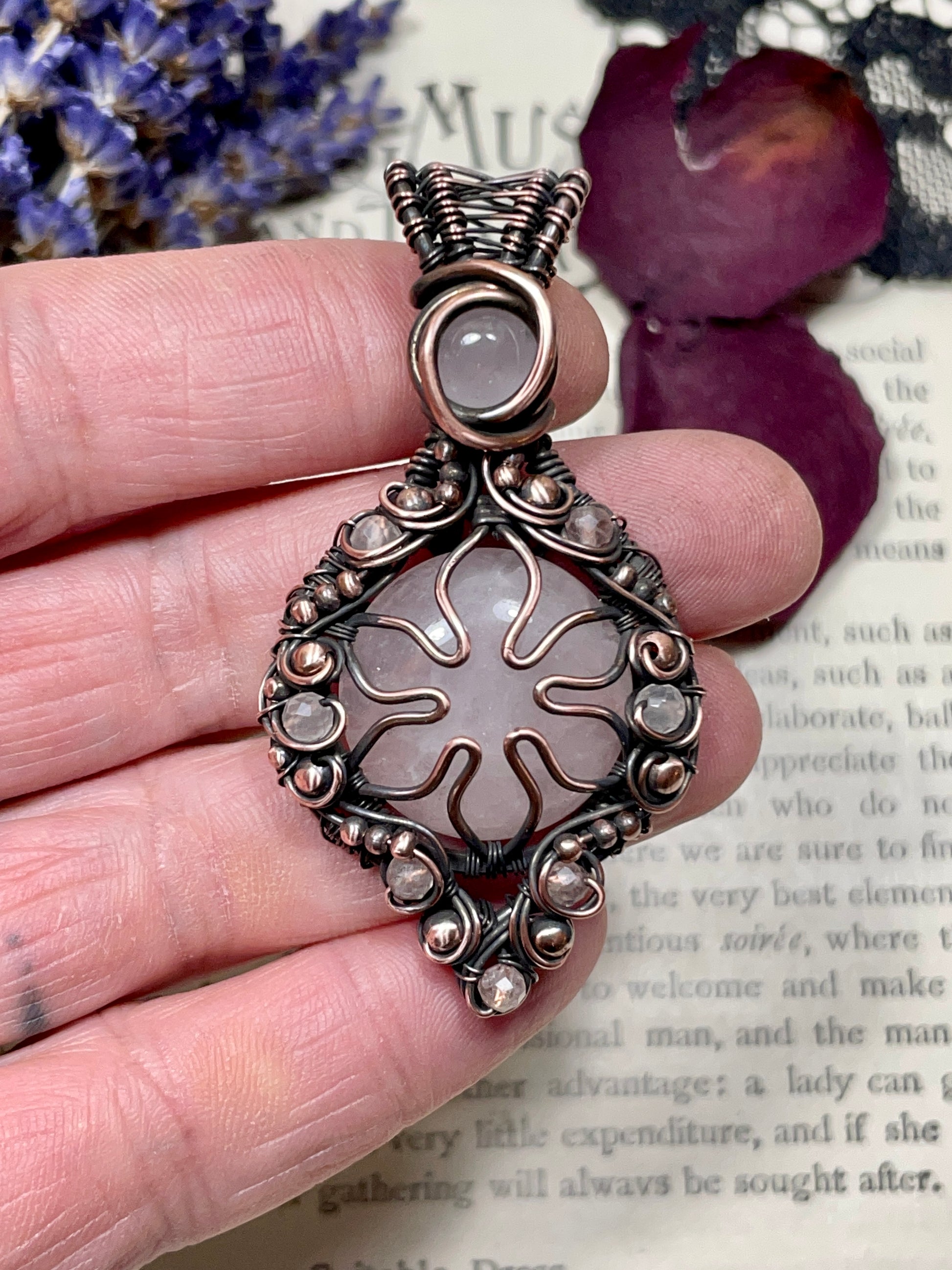 I have hand cut and wrapped this beautiful Ontario Rose Quartz Cabochon in bare copper and then added a flower to the front and topped it with a smaller rose quartz cabochon. I then embellished it with copper and faceted Rose Quartz beads.