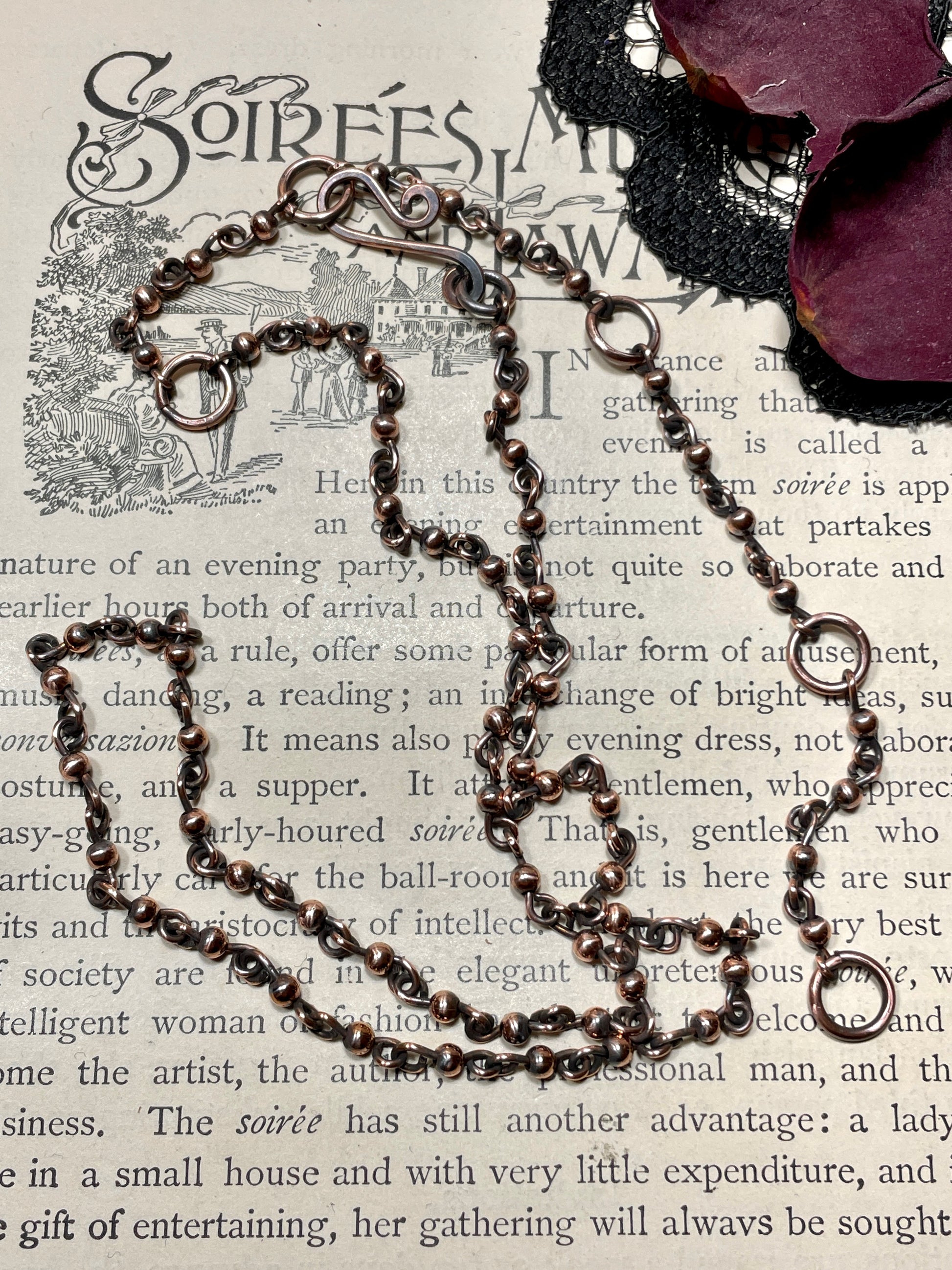 This adjustable chain features hand made links embellished with 3mm copper beads, hand sawn jump rings and a hand made hook and eye closure. This chain can be worn at various lengths. (Approximately 18”, 19.5”, 21”, 22.5 and 24”)