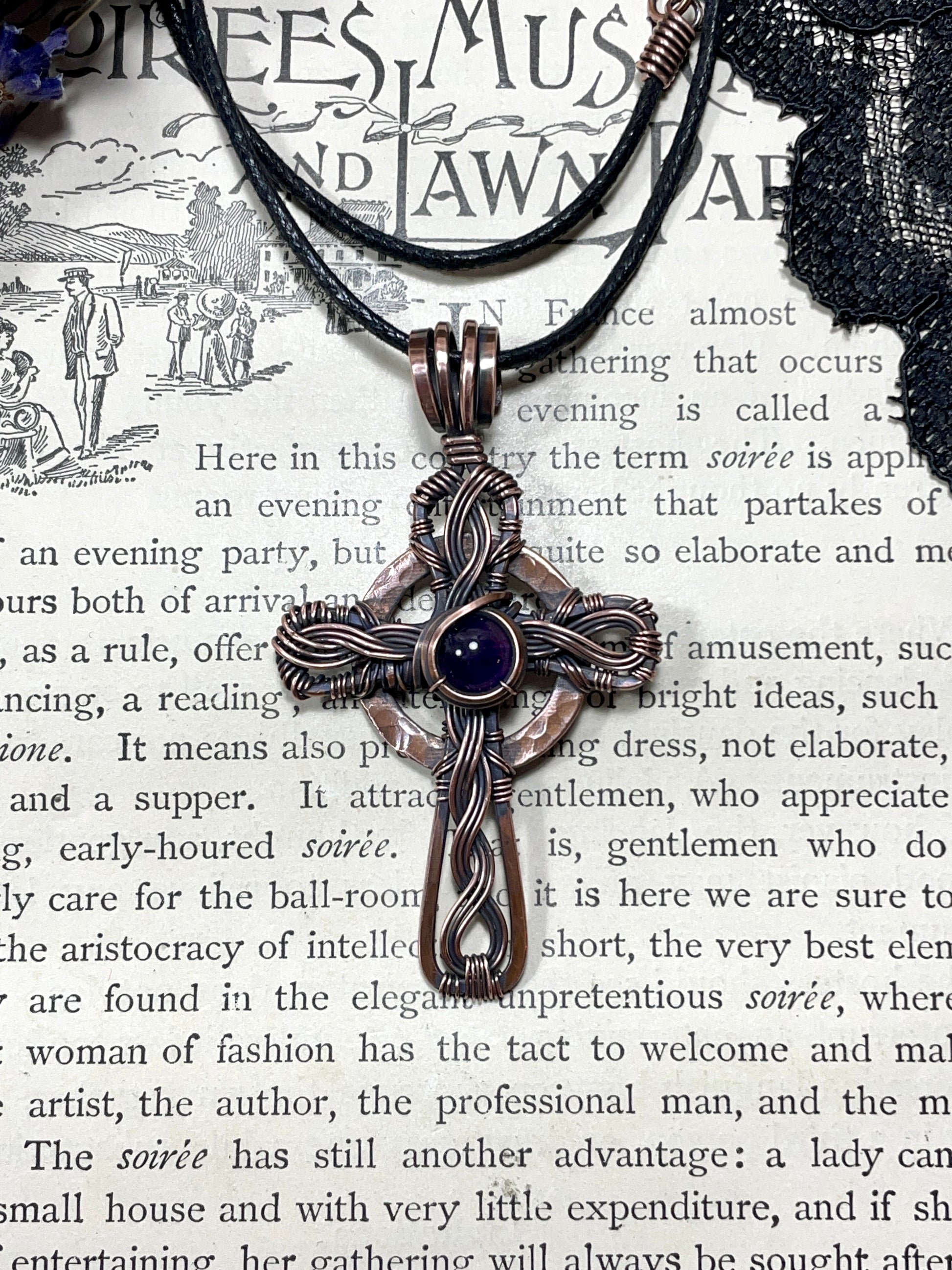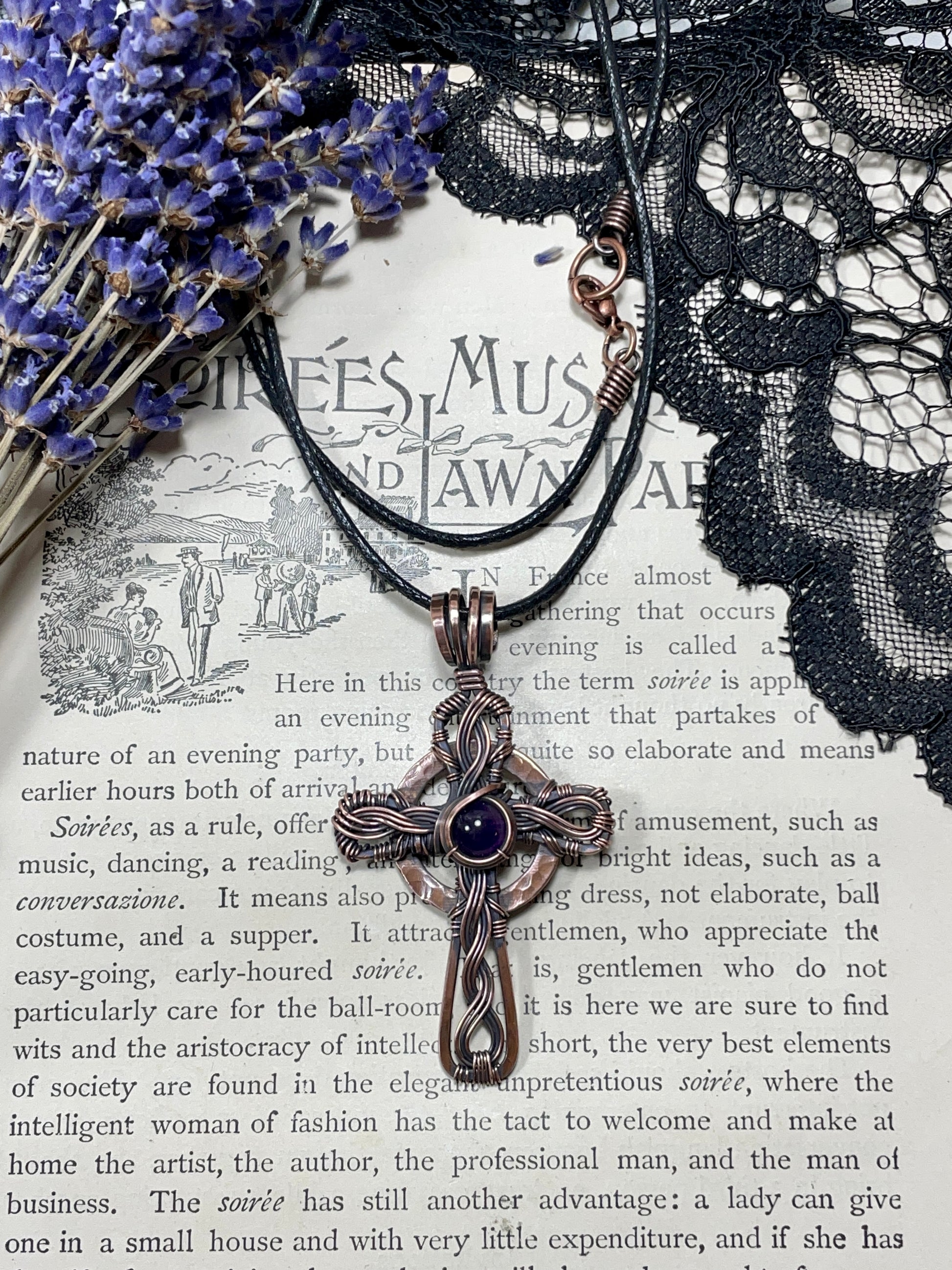I have created this Celtic Cross using bare hammered and woven copper wire, and I have added a small Amethyst cabochon to the piece. This piece was then antiqued and hand polished it to give it a beautiful antique finish.
