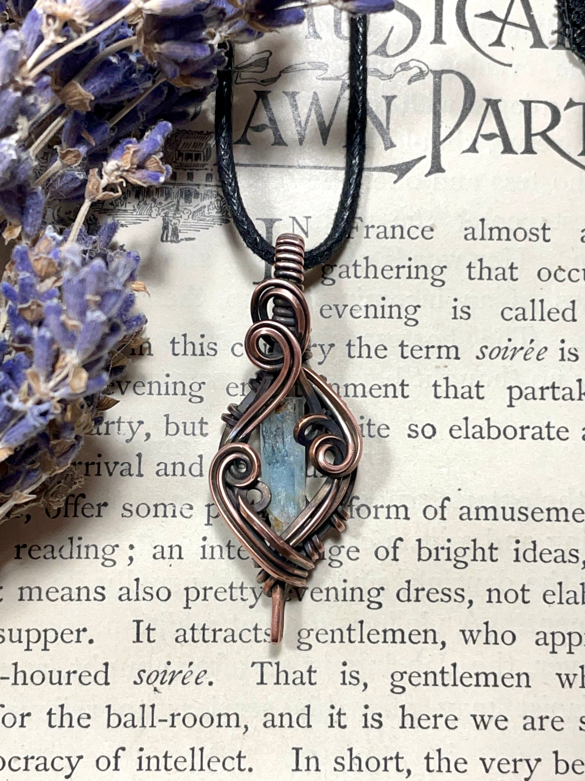 I have wrapped this beautiful pale blue Aquamarine crystal in my fantasy inspired “Elwyn” style in antiqued copper wire and was hand polished to achieve its nice bright finish. Elwyn means Friend of the elves in Old English.