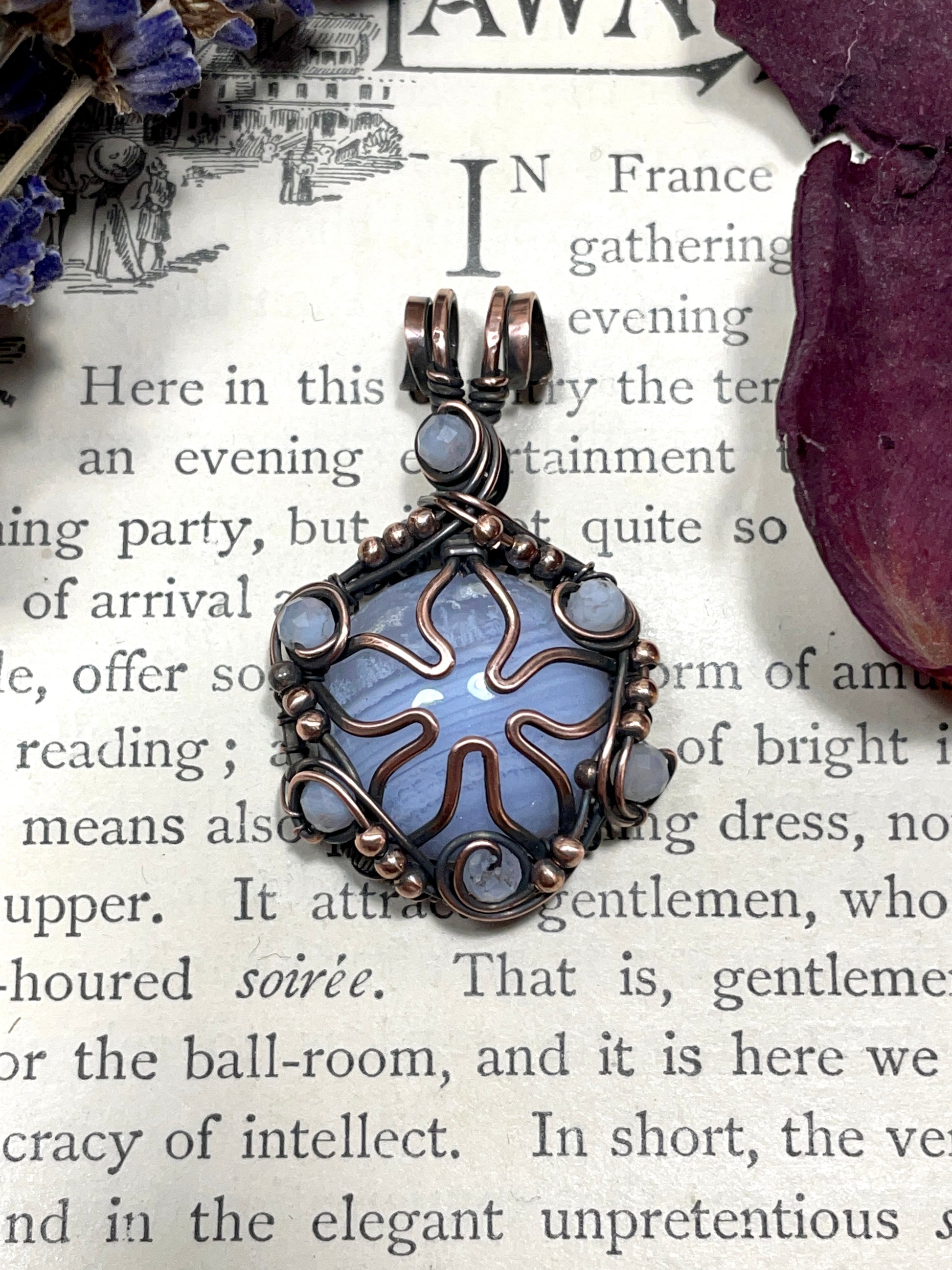I have hand cut and wrapped this beautiful Blue Lace Agate Cabochon in bare copper and then added a flower to the front and embellished it with copper and faceted blue lace agate beads.