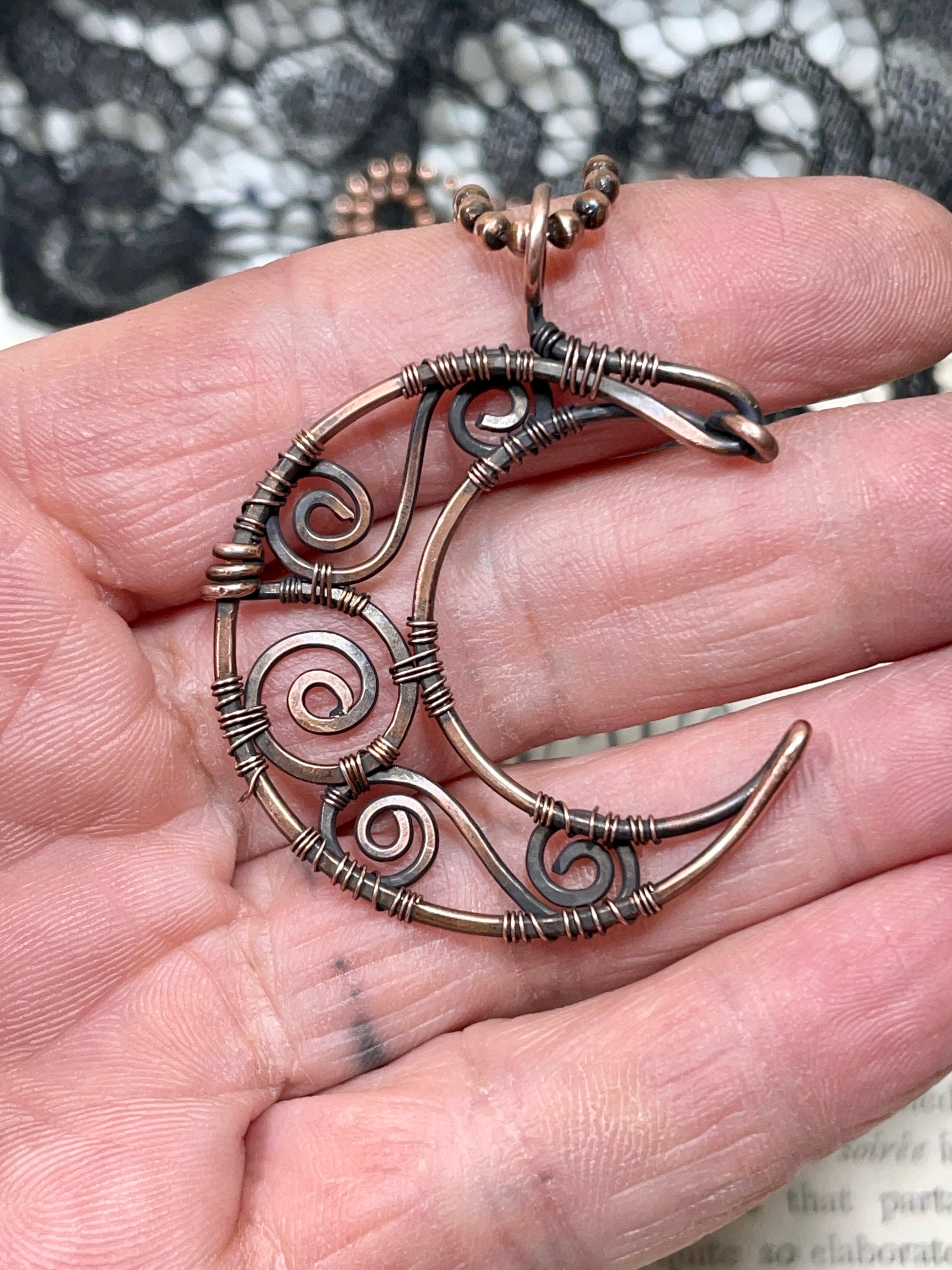 This is a hammered antiqued copper  crescent moon pendant with scrolling spiral hammered embellishments.