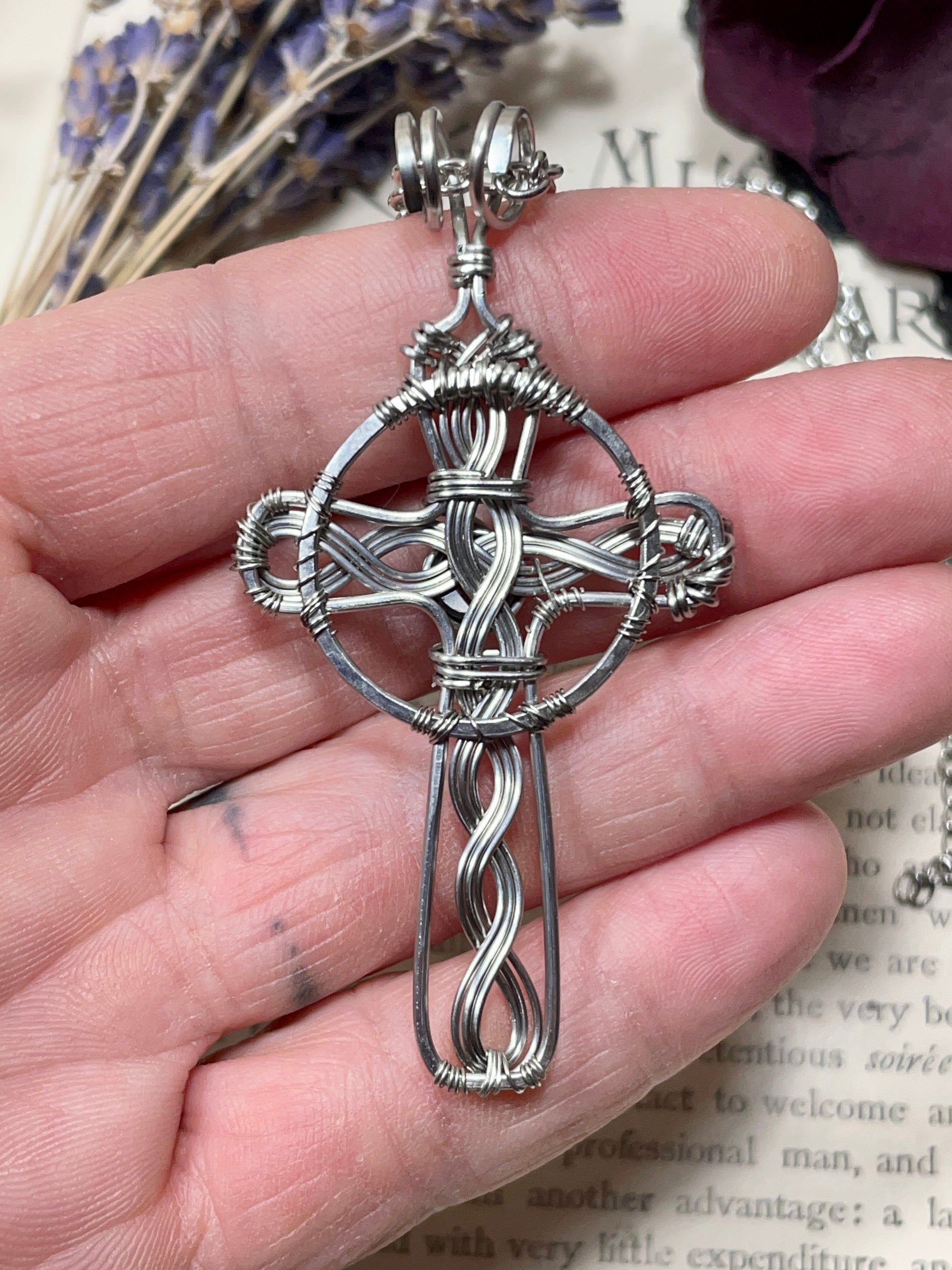 I have created this Celtic Cross using bare hammered and woven stainless steel wire, and I have added a small garnet cabochon to the piece.