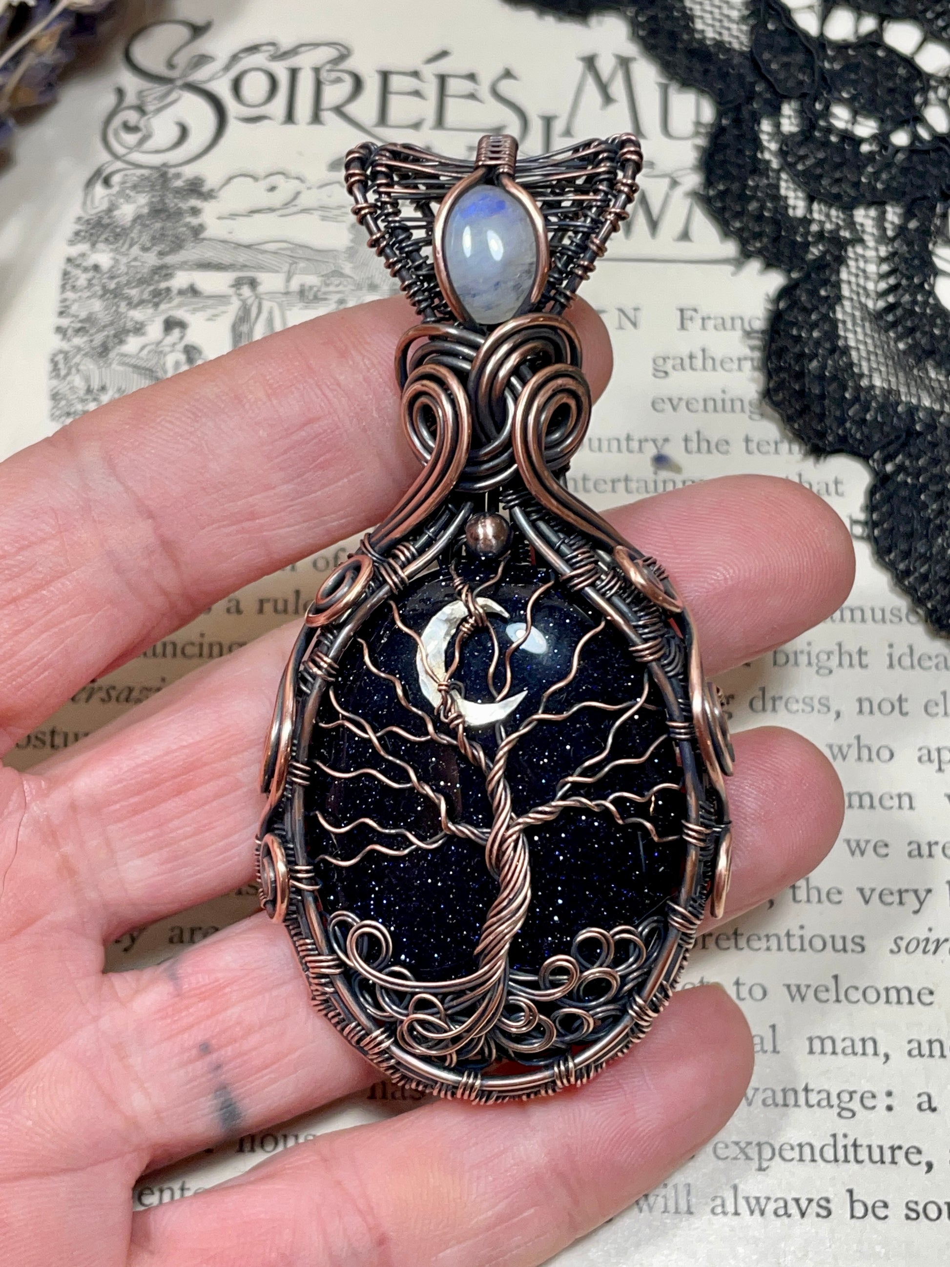 I have set this beautiful Blue Goldstone Cabochon in bare hammered and woven copper and then woven a tree of life to the front. She’s embellished with a hammered sterling silver crescent moon through the branches and a smaller rainbow moonstone set in the bale.