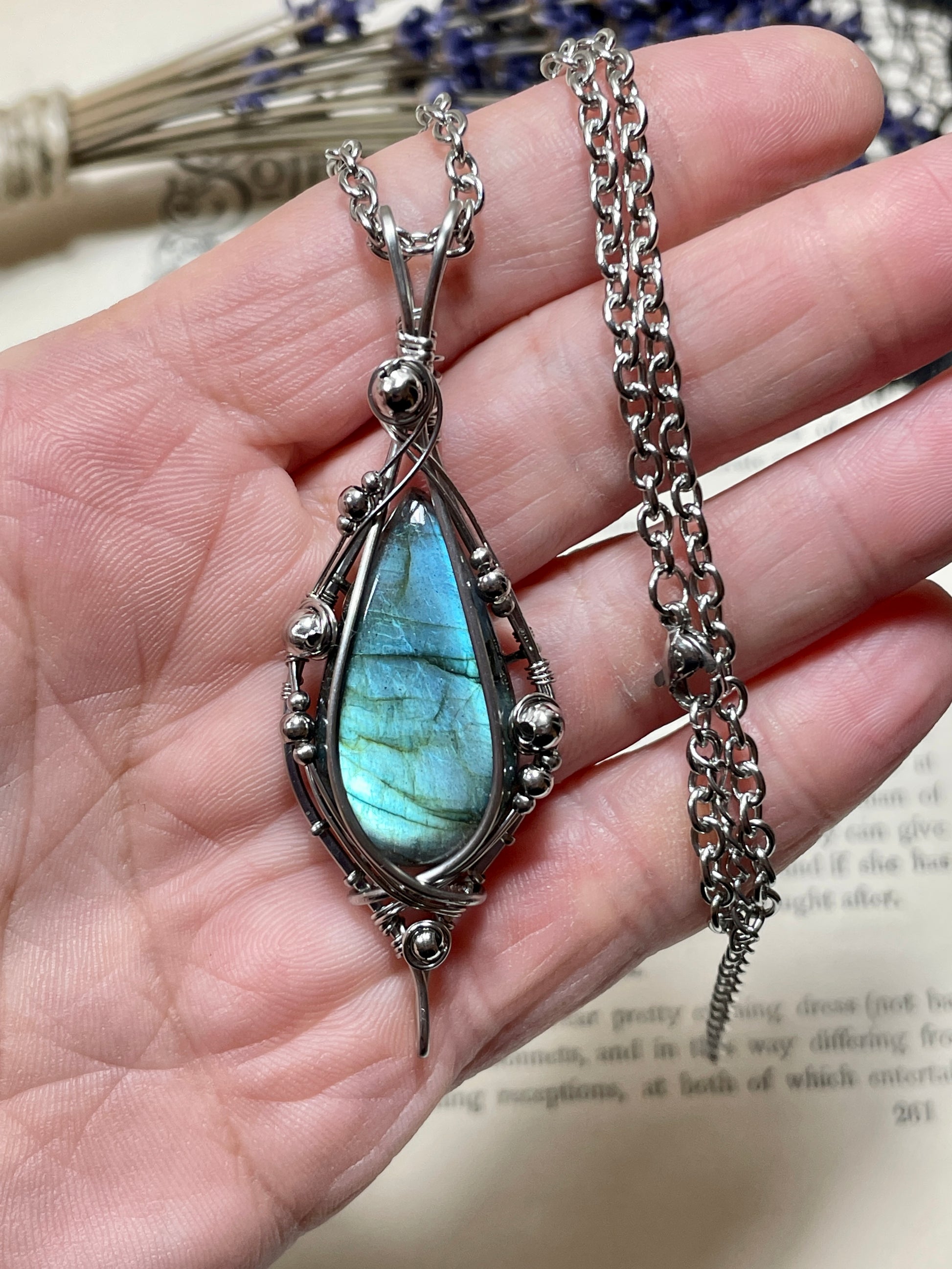 I have hand cut and set this beautiful Labradorite in 316 surgical Stainless Steel, with flowing accents and embellished with stainless steel beads.