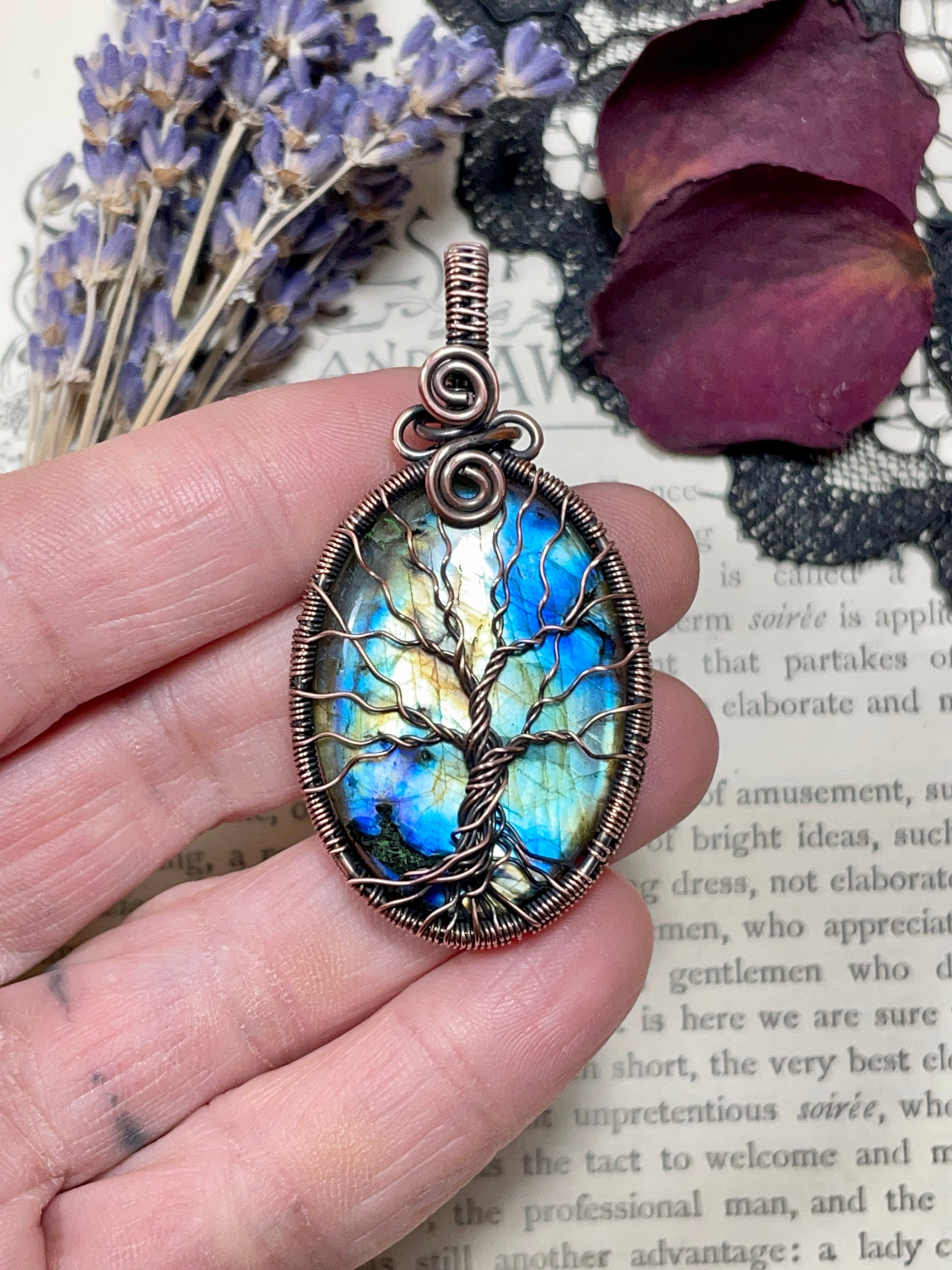 I have wrapped this Labradorite Cabochon (Aqua Carvings) in woven bare copper wire and it is adorned with a tree of life.