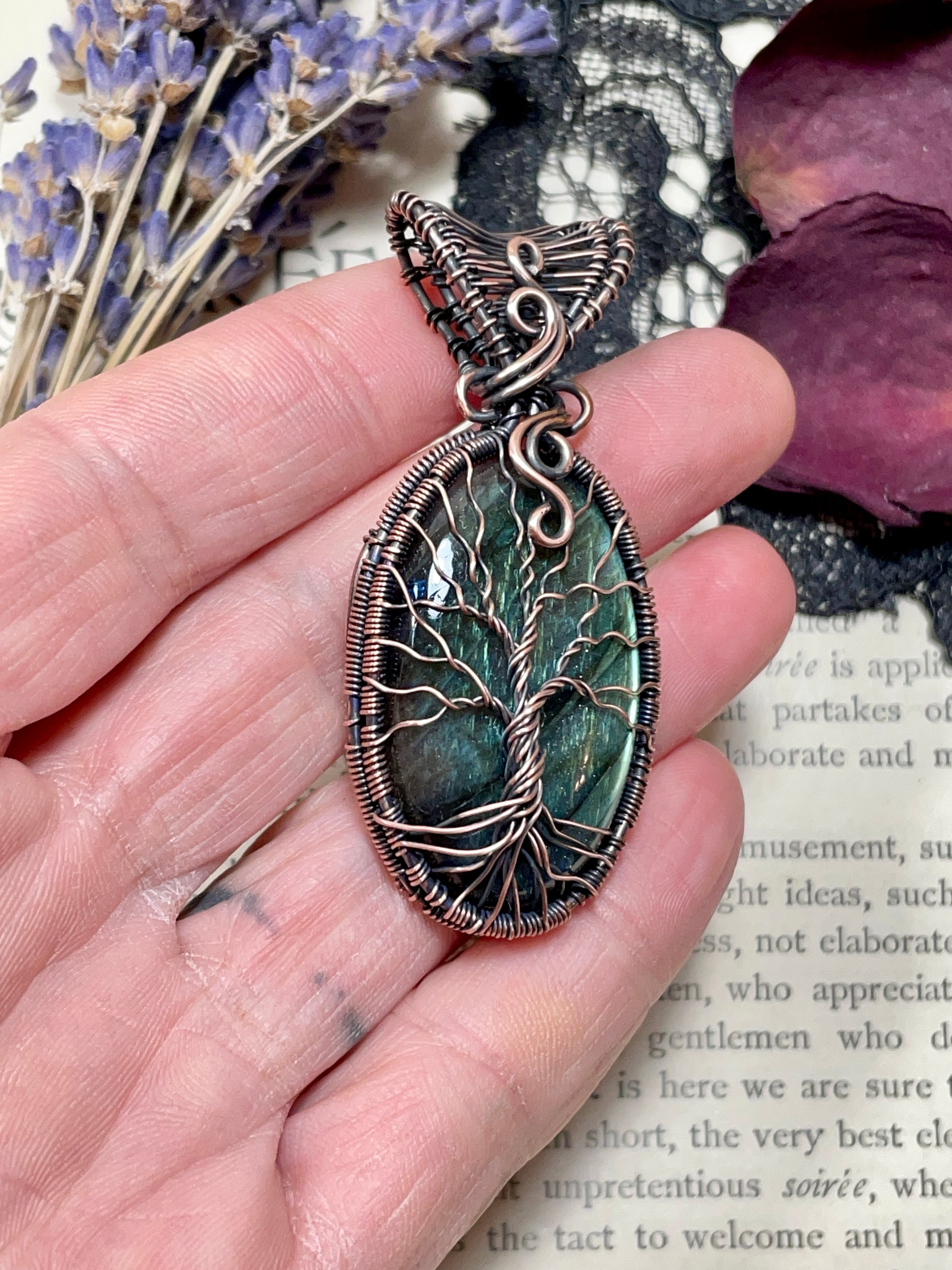 I have wrapped this Labradorite Cabochon (Aqua Carvings) in woven bare copper wire and it is adorned with a tree of life.