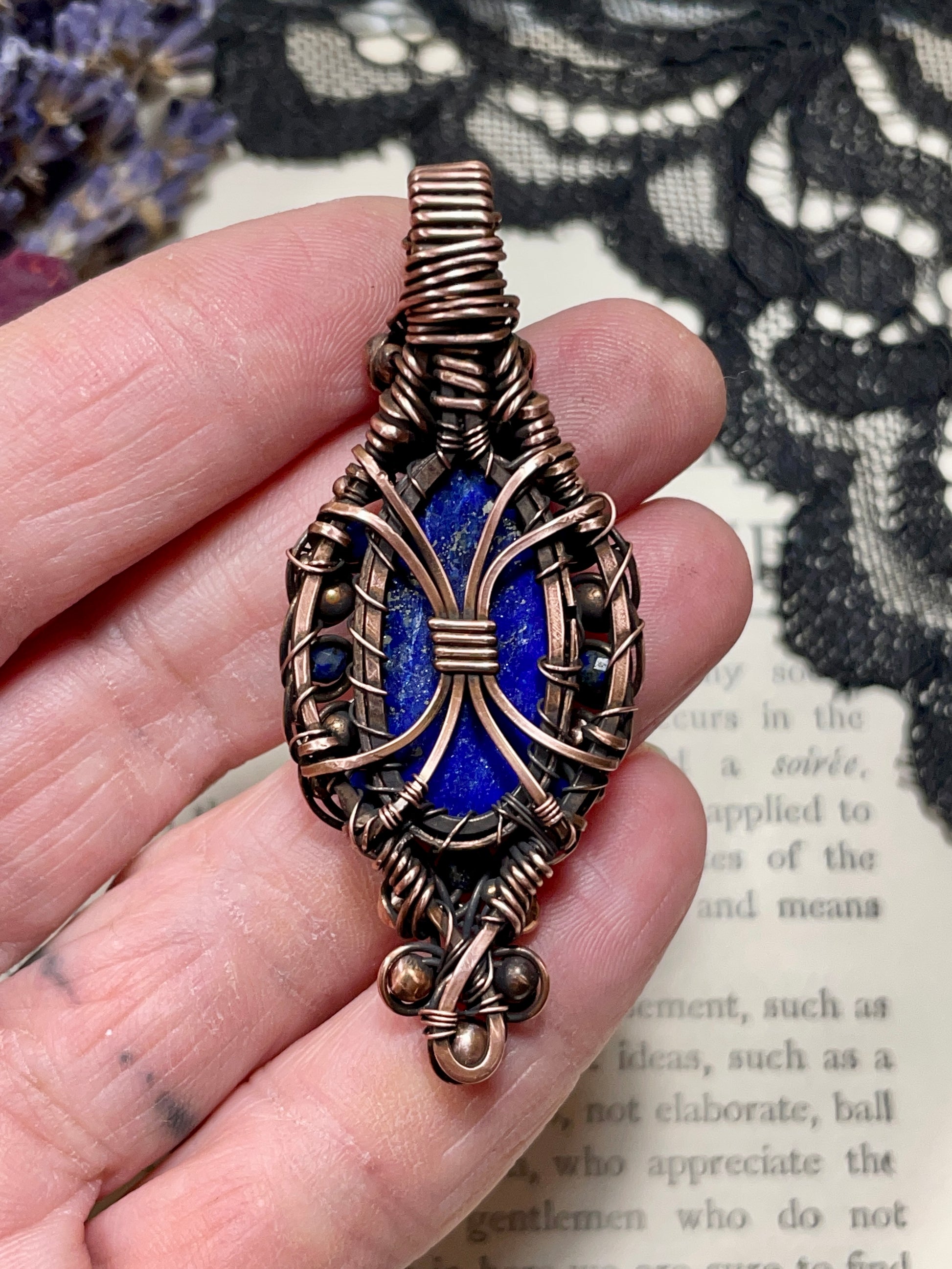 I have hand cut and set this Lapis Lazuli cabochon in hammered and woven bare copper wire. This piece has been set in gallery bezel wire and been embellished with copper and faceted lapis beads. This piece was then antiqued and hand polished it to give it a beautiful antique finish.