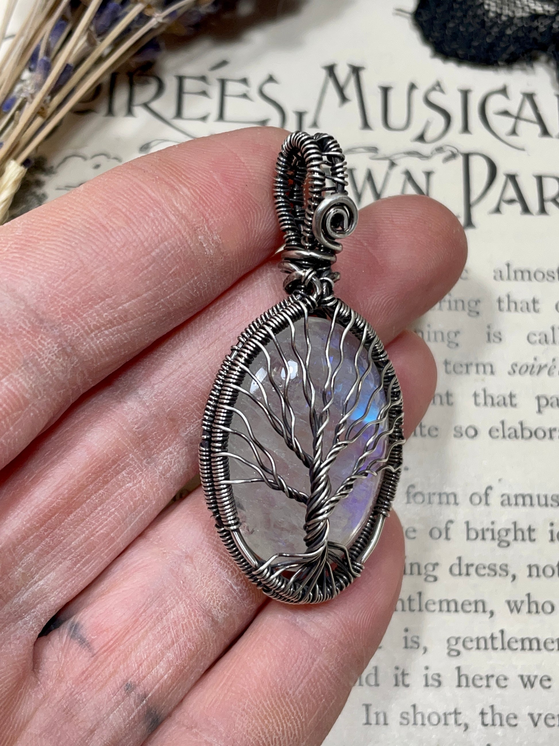 I have wrapped this flashy Rainbow Moonstone Cabochon (Moonstone Gems) in sterling silver wire. She has been adorned with a Tree of Life and I have antiqued and hand polished it to give it its beautiful rich finish.