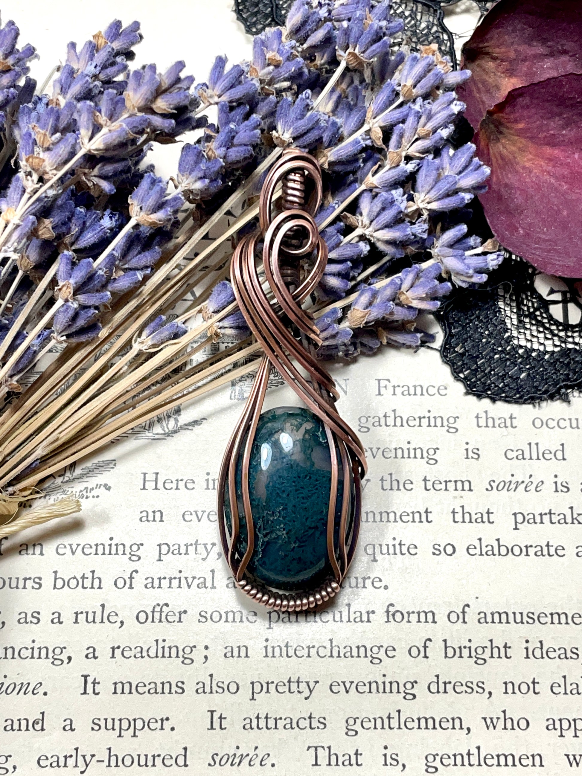 I have hand cut and wrapped this Moss Agate Cabochon in bare copper wire in an elegant design.