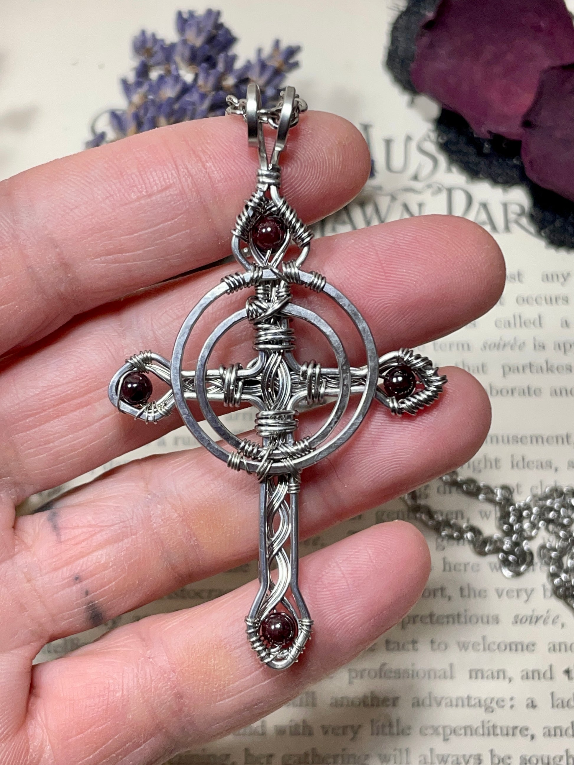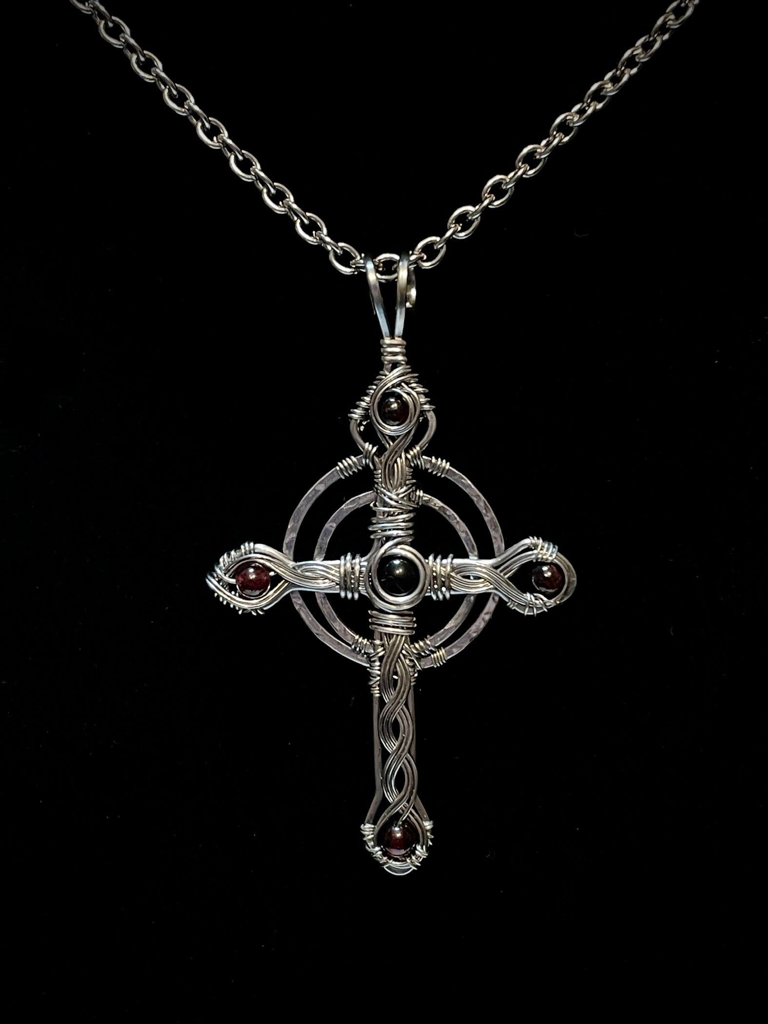 I have created this Celtic Cross using bare hammered and woven stainless steel wire, and I have added a small onyx cabochon and garnet beads to the piece.