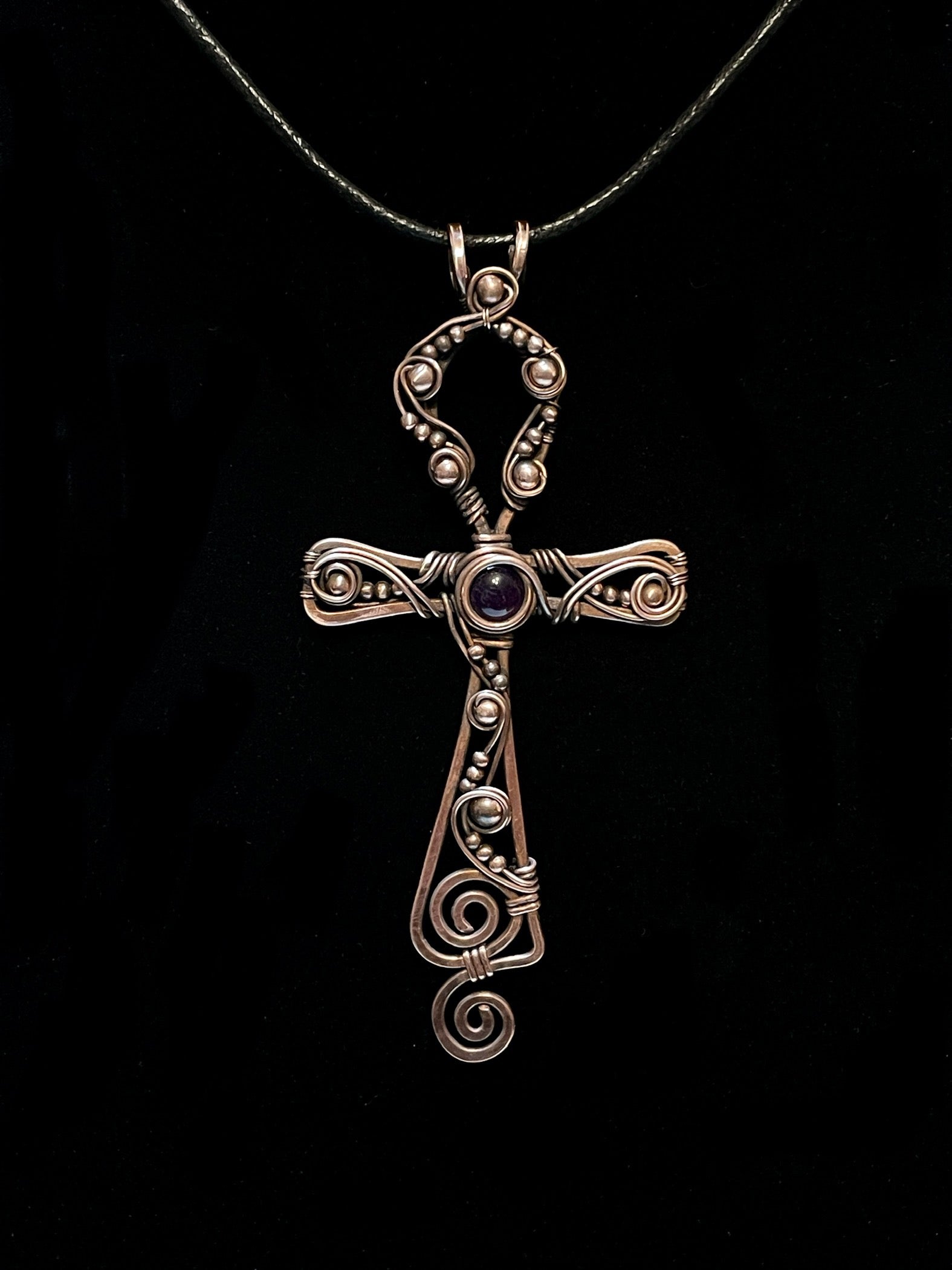 I have created this Ankh using bare hammered and woven copper wire, and I have added a small amethyst cabochon to the piece. This piece was then antiqued and hand polished it to give it a beautiful antique finish.