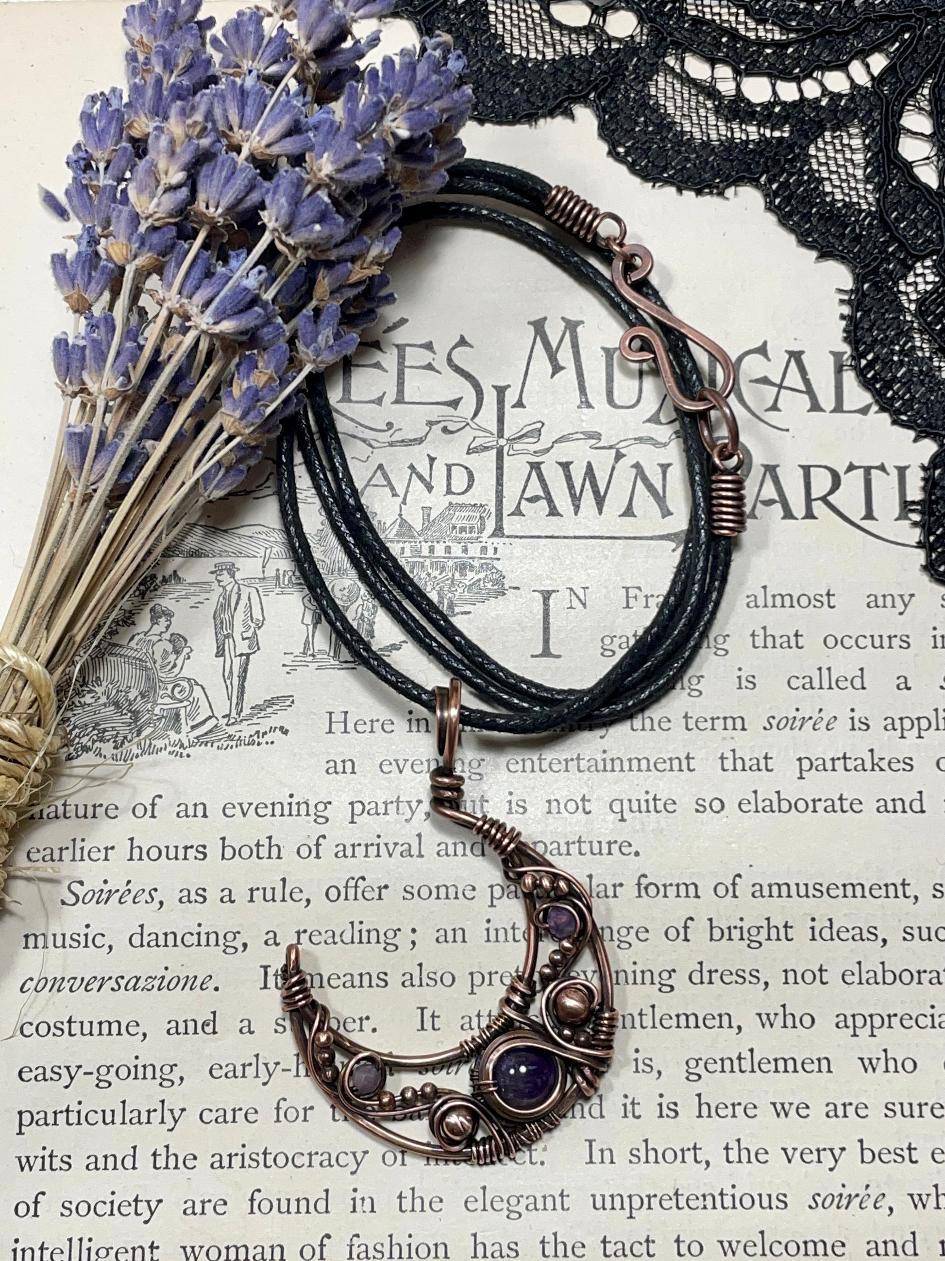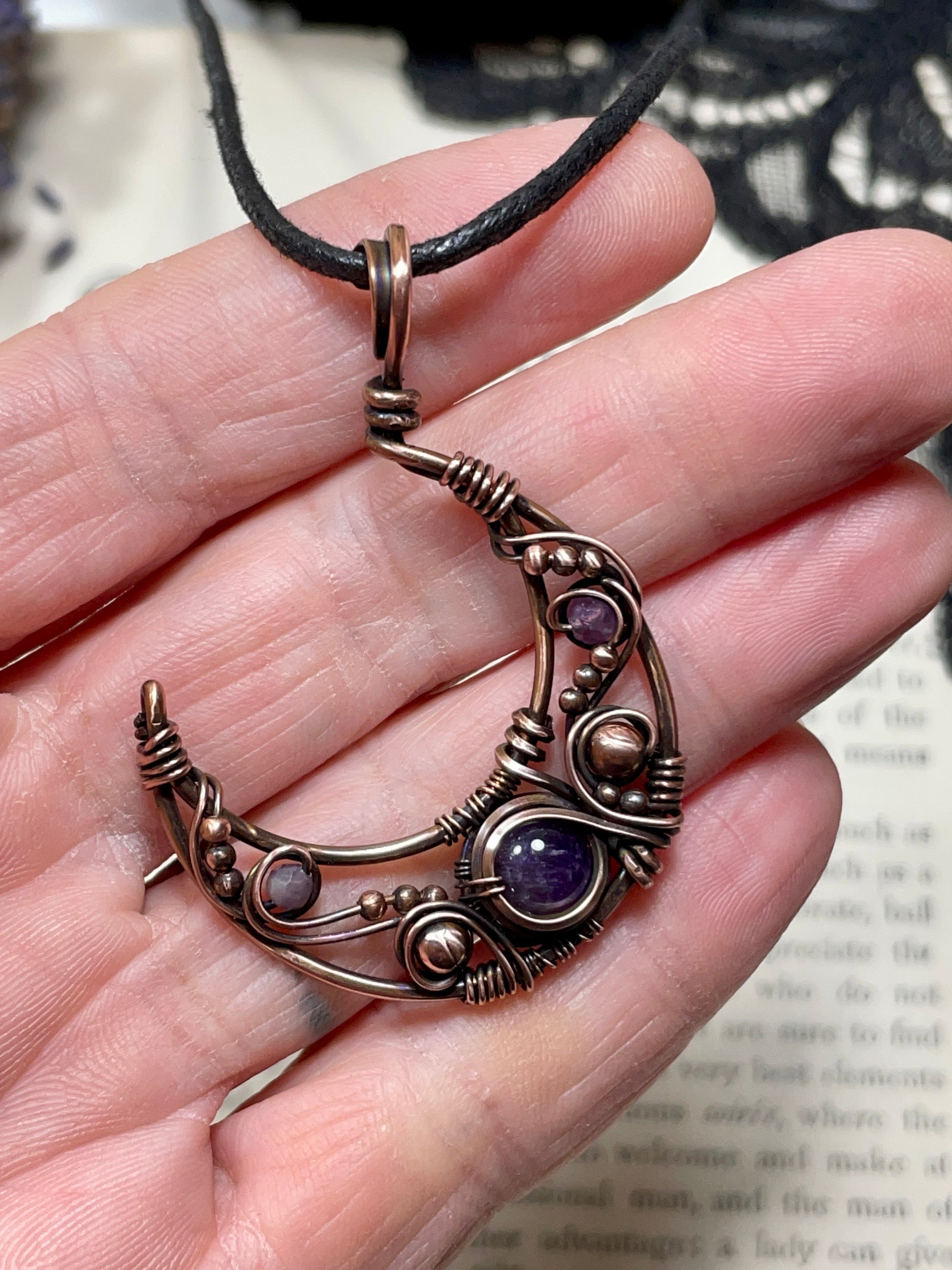 This hammered and woven antiqued copper crescent moon pendant was made with various sizes of wire, adorned with an Amethyst cabochon centrepiece and embellished with copper and faceted amethyst beads.