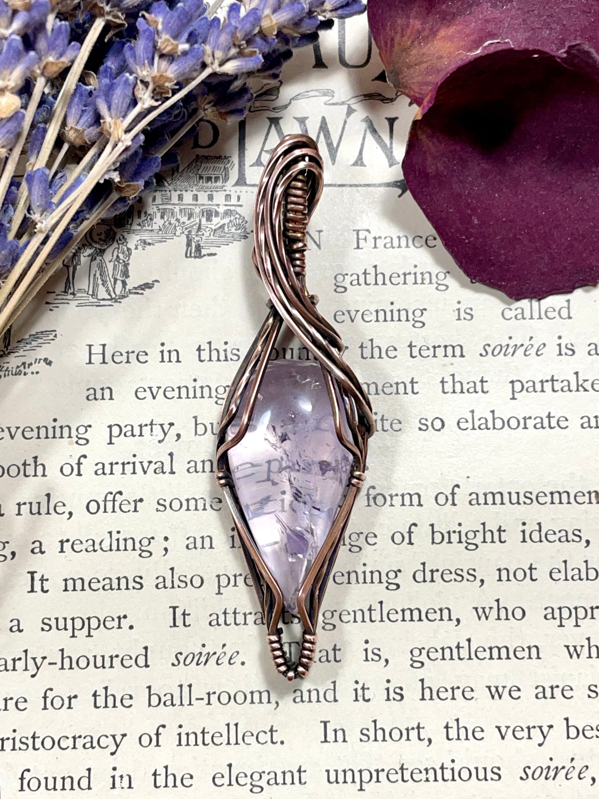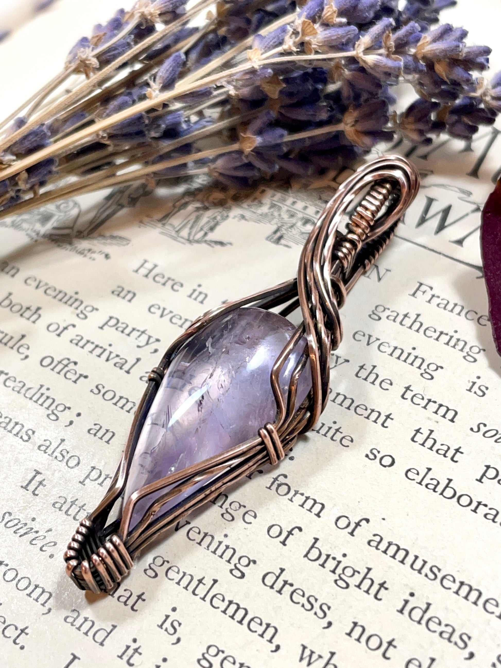 I have hand cut and wrapped this pale Lavender Amethyst Cabochon in copper wire.