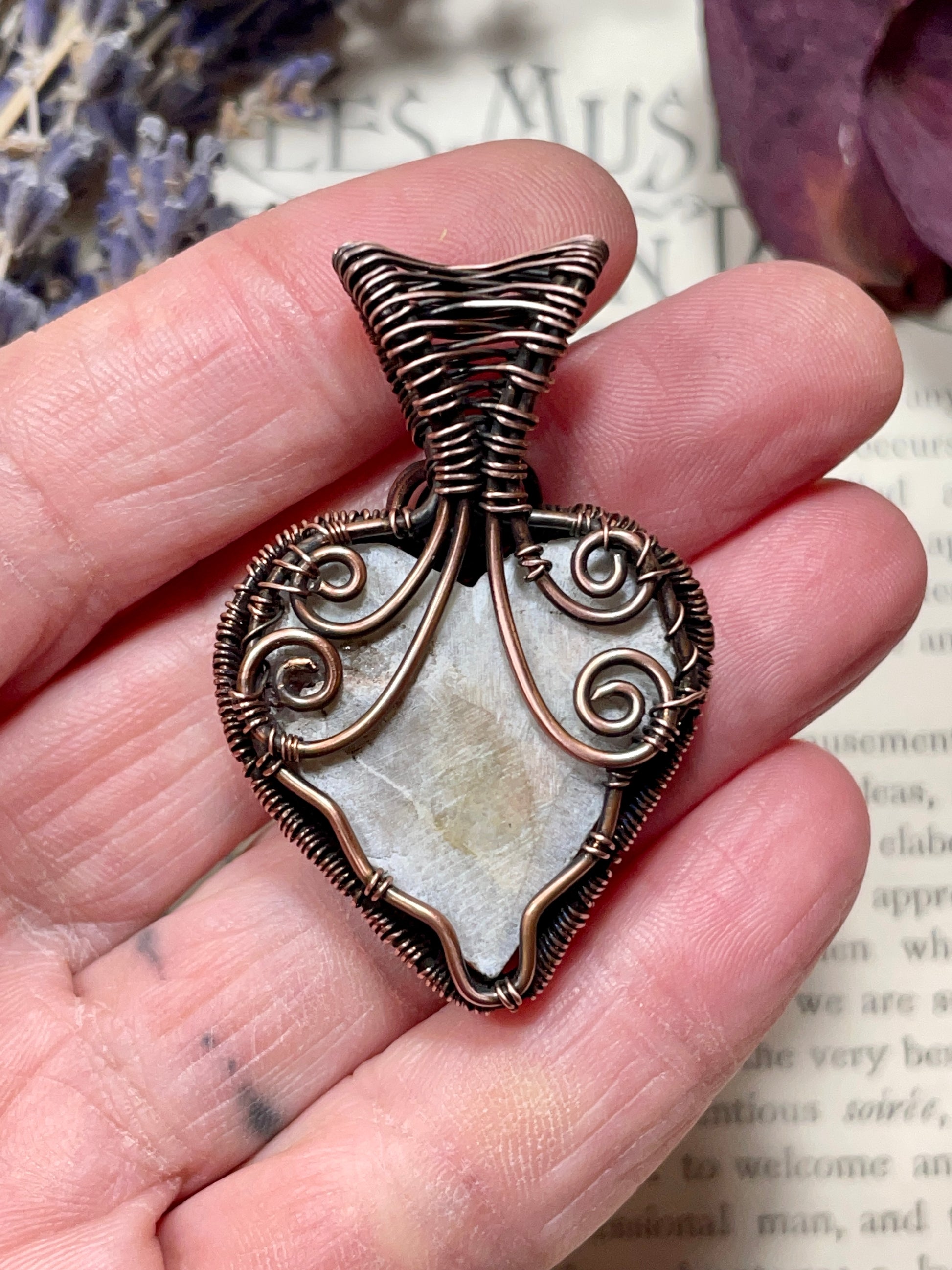 I have cut and wrapped this beautiful heart piece in a fantasy inspired style in bare copper wire.