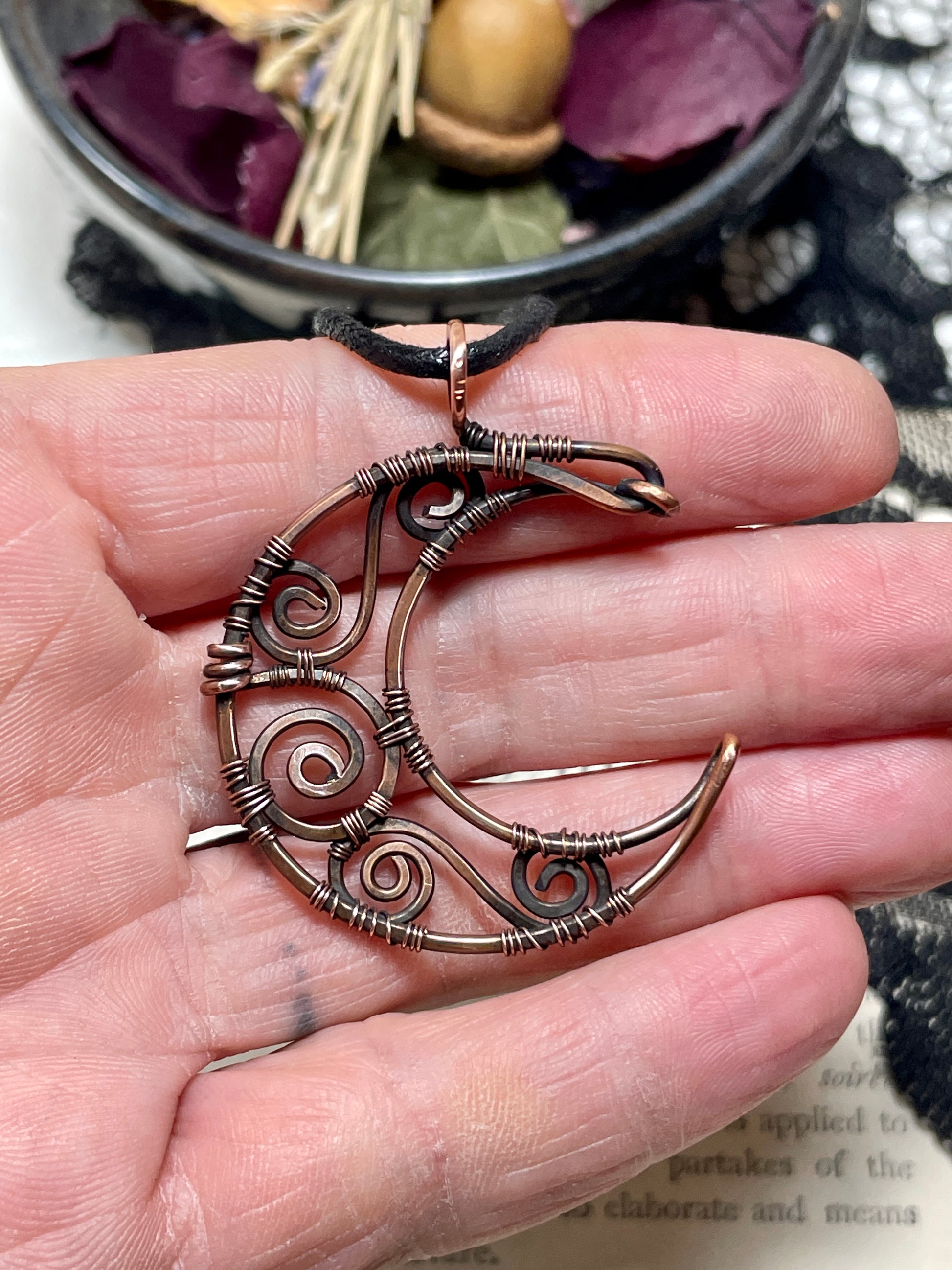 This is a hammered antiqued copper  crescent moon pendant with scrolling spiral hammered embellishments.