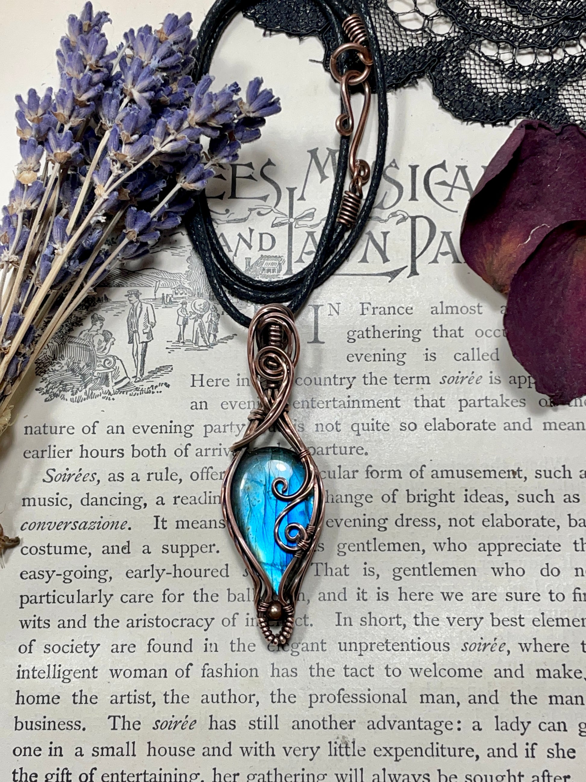 I have wrapped this beautiful blue flash labradorite piece in bare copper wire with flowing accents and an added bead embellishment. This piece was then antiqued and hand polished it to give it a beautiful antique finish.