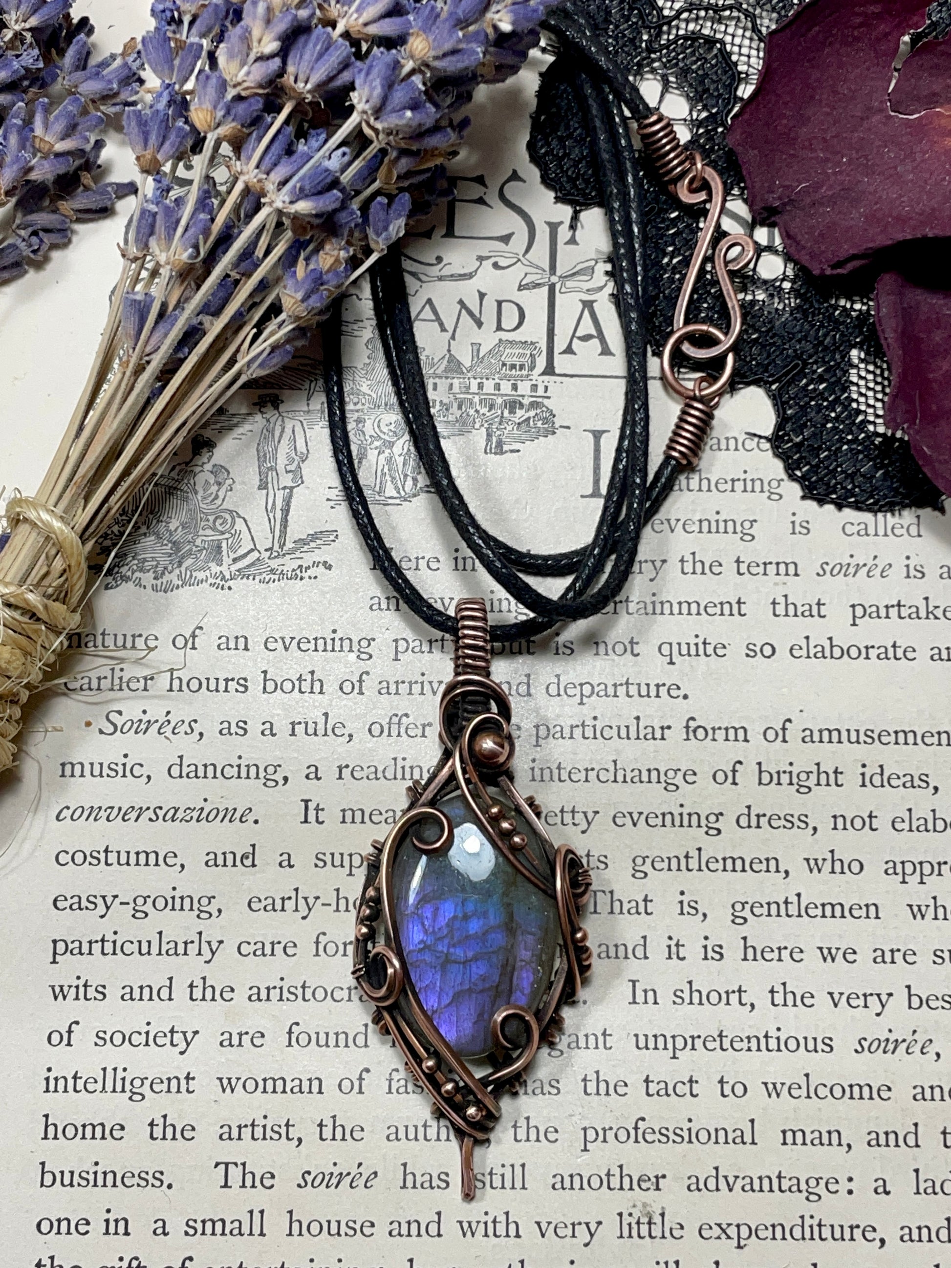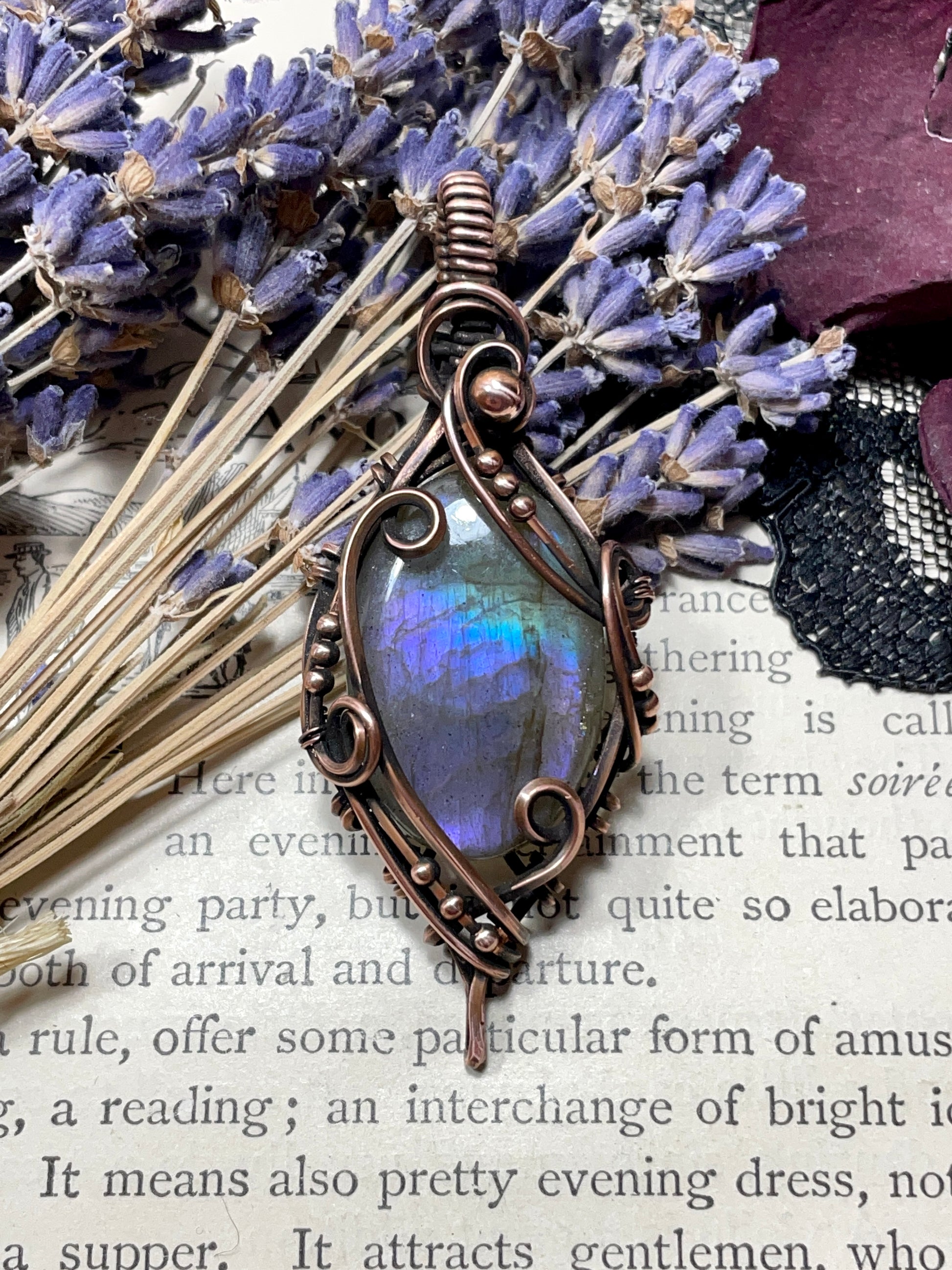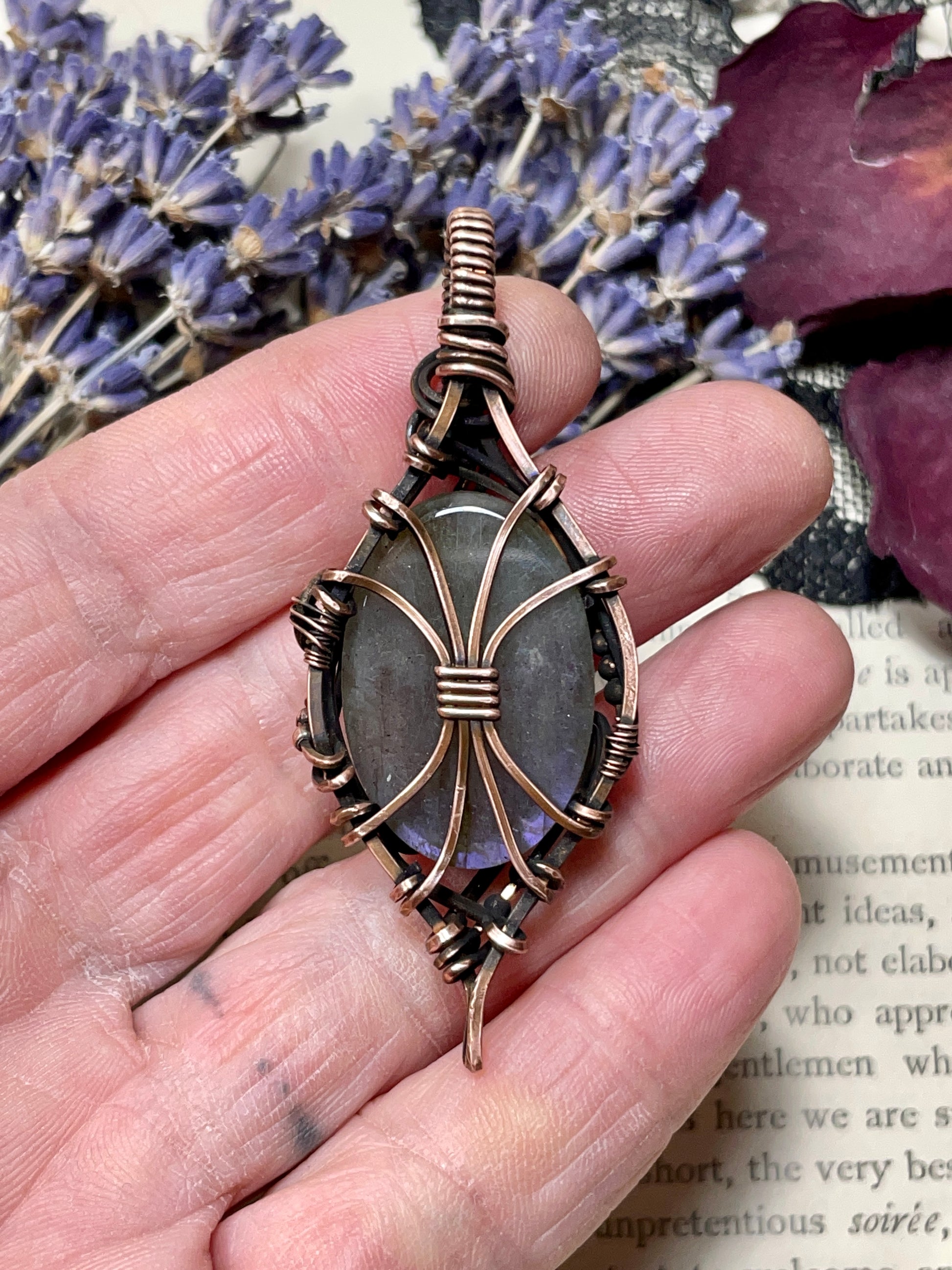 I have wrapped this beautiful labradorite piece in bare copper wire with flowing accents and an added bead embellishments. This piece was then antiqued and hand polished it to give it a beautiful antique finish.
