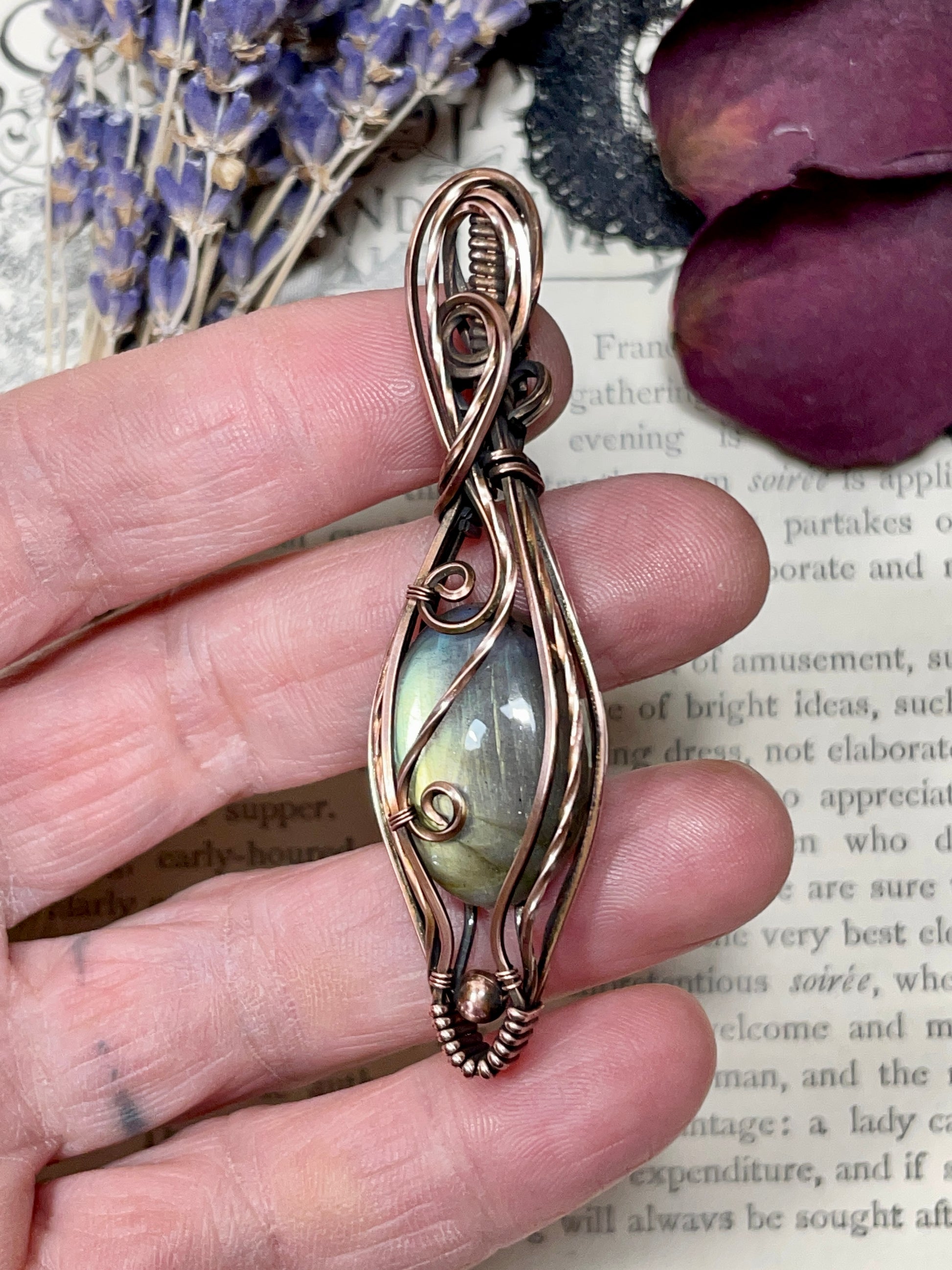 I have wrapped this beautiful labradorite piece in bare copper wire with flowing accents and an added bead embellishments. This piece was then antiqued and hand polished it to give it a beautiful antique finish.