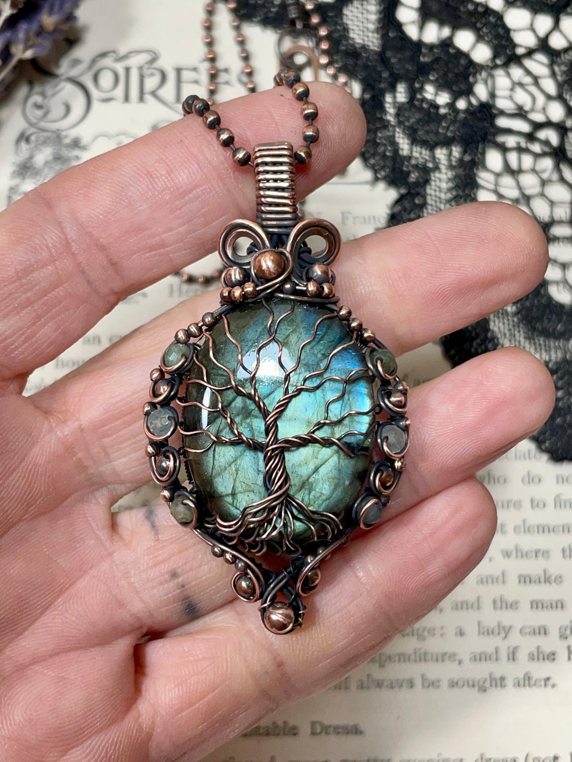 This is a hand crafted fantasy inspired Labradorite Amulet adorned with the Tree Of Life.