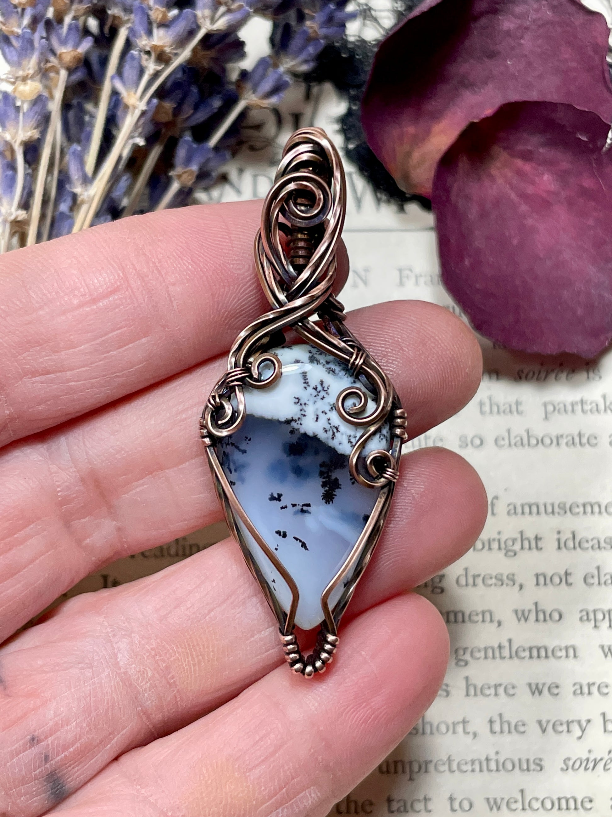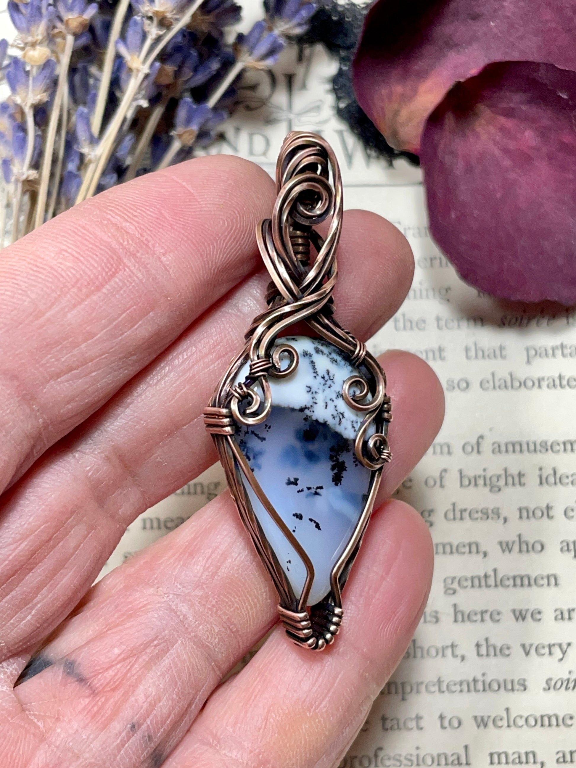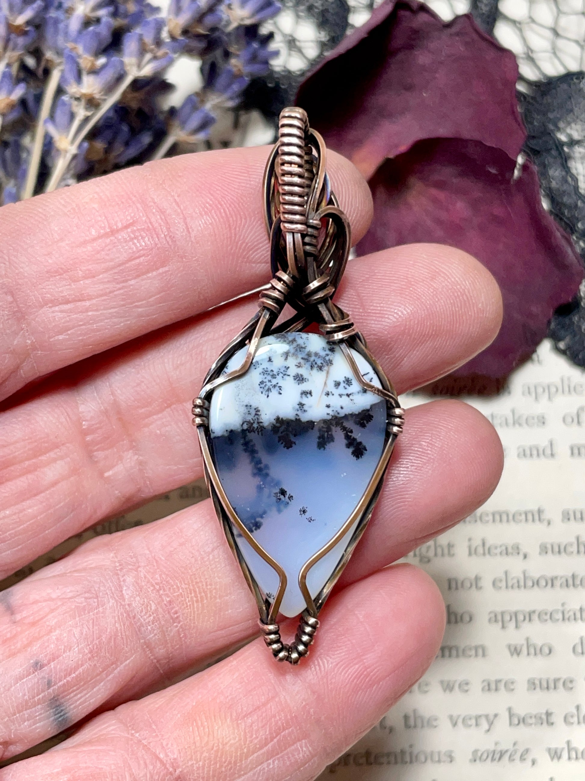 I have wrapped this beautiful hand cut Merlinite cabochon from my good friends at NikMak Crystals in bare Copper wire.