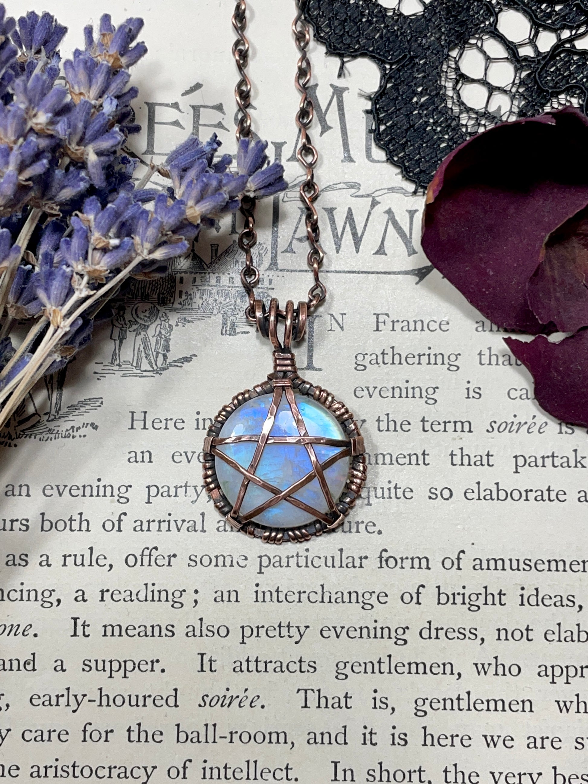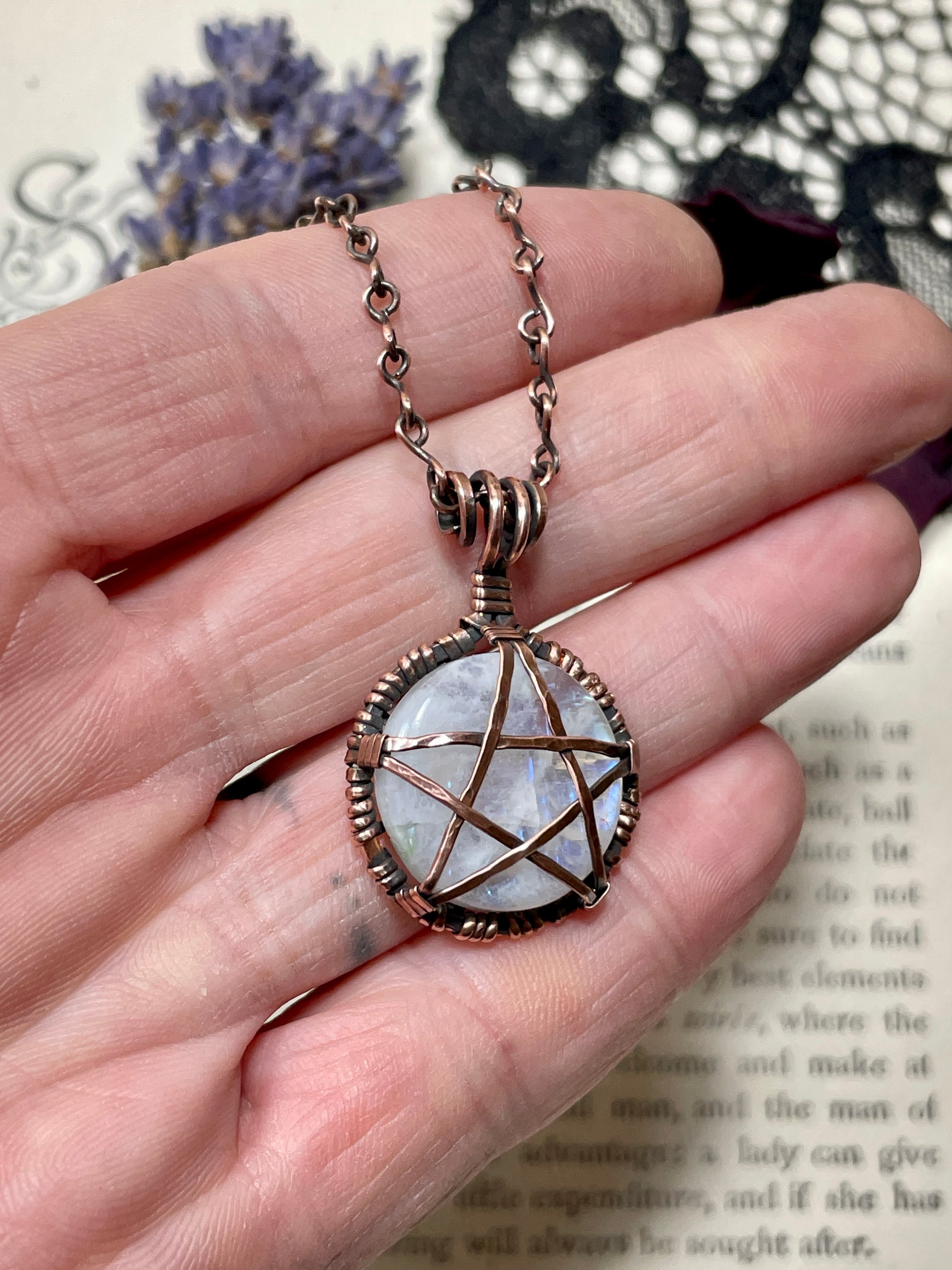 Moonstone (Rainbow Moonstone) Pentacle Pendant in Antiqued Copper