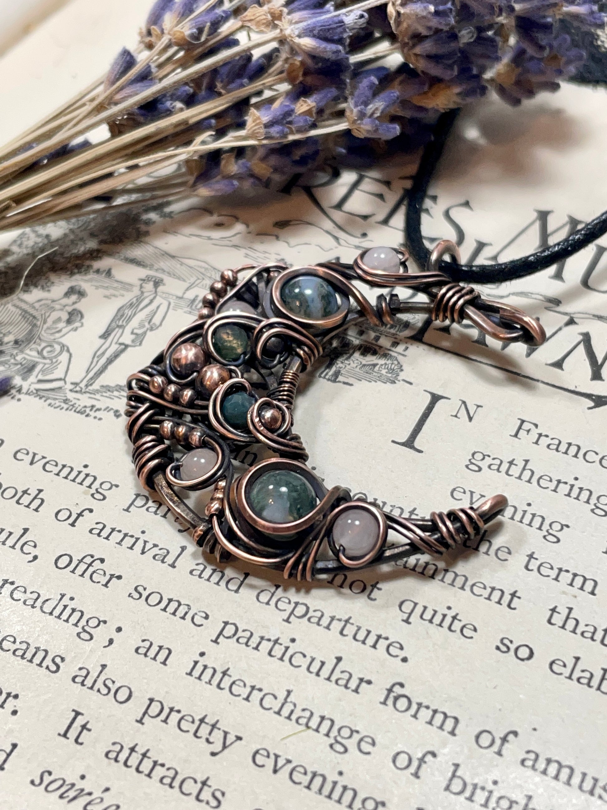 This hammered and woven antiqued copper crescent moon pendant was made with various sizes of wire, adorned with curls and swirls and embellished with moss agate, rose quartz and copper beads.