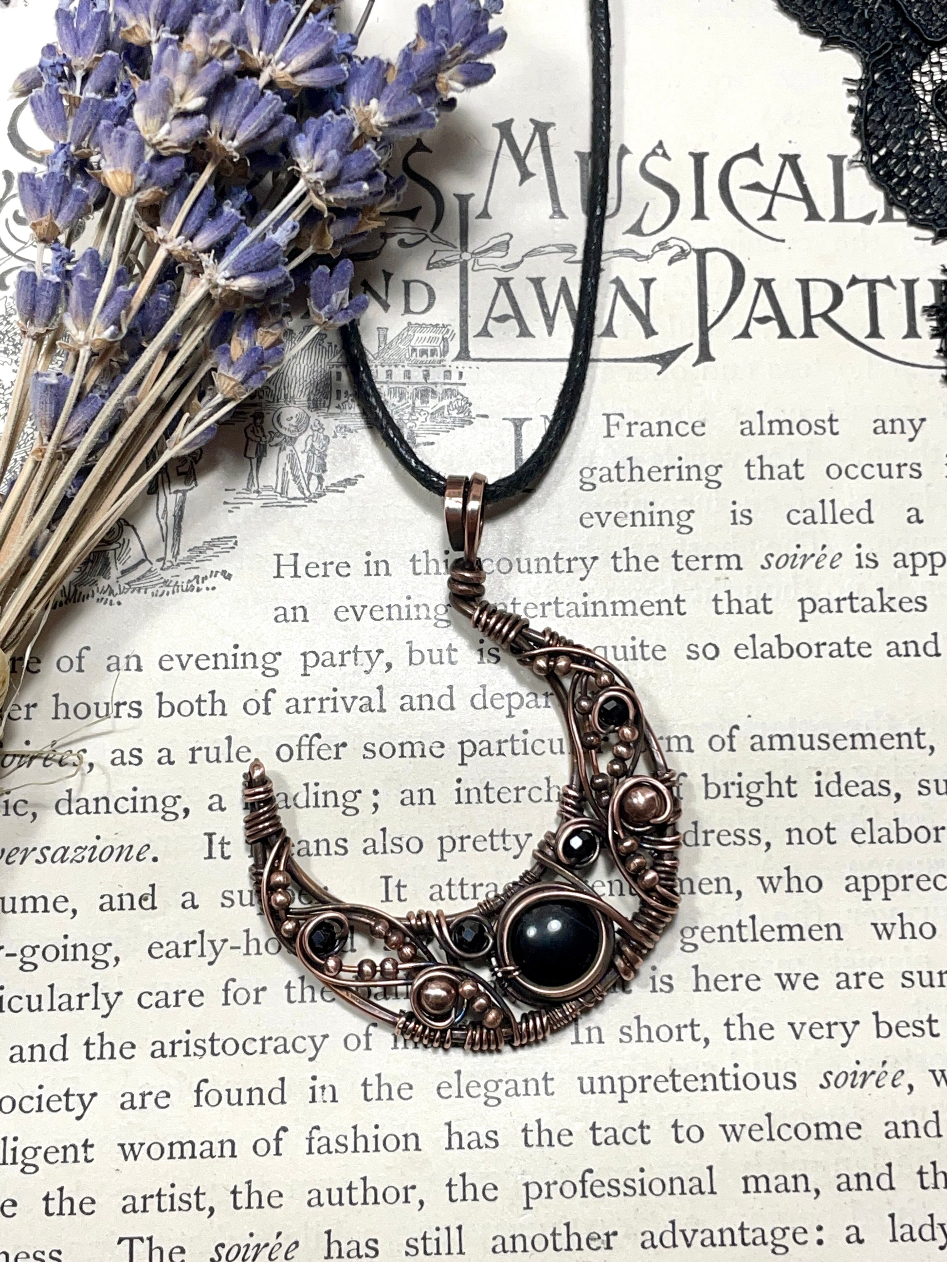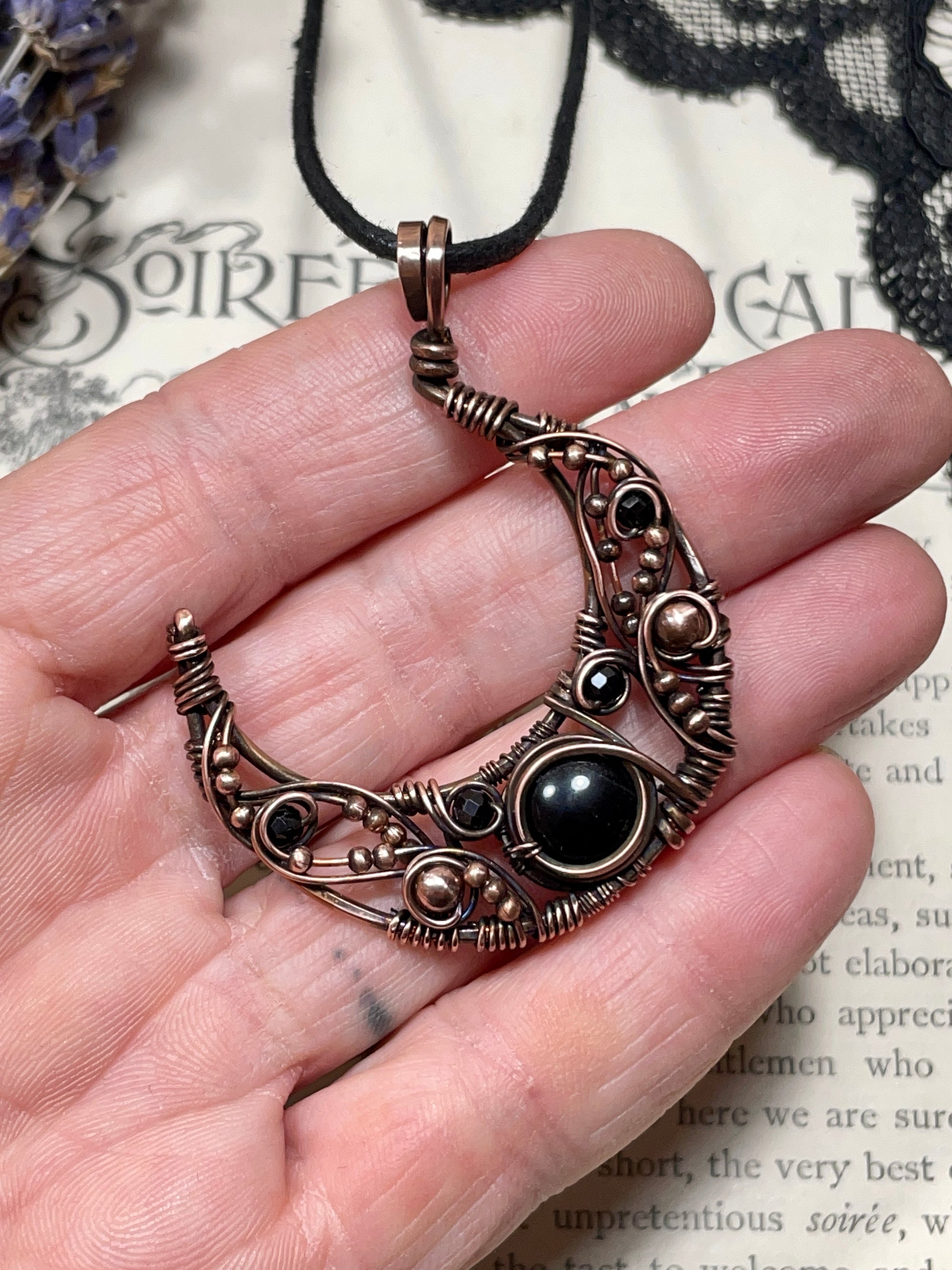 This hammered and woven antiqued copper crescent moon pendant was made with various sizes of wire, adorned with a heated black onyx cabochon centrepiece and embellished with copper and faceted spinel beads.