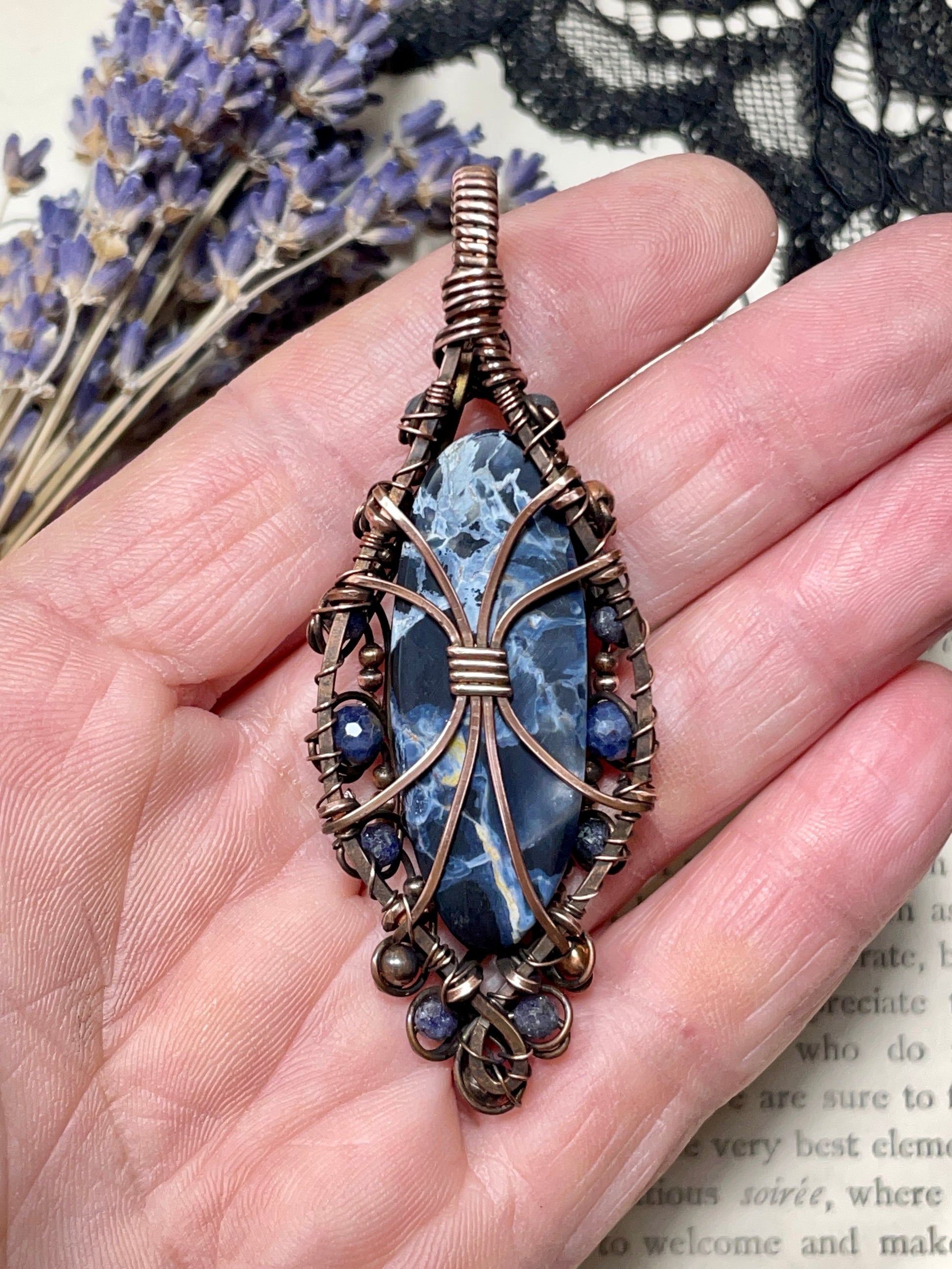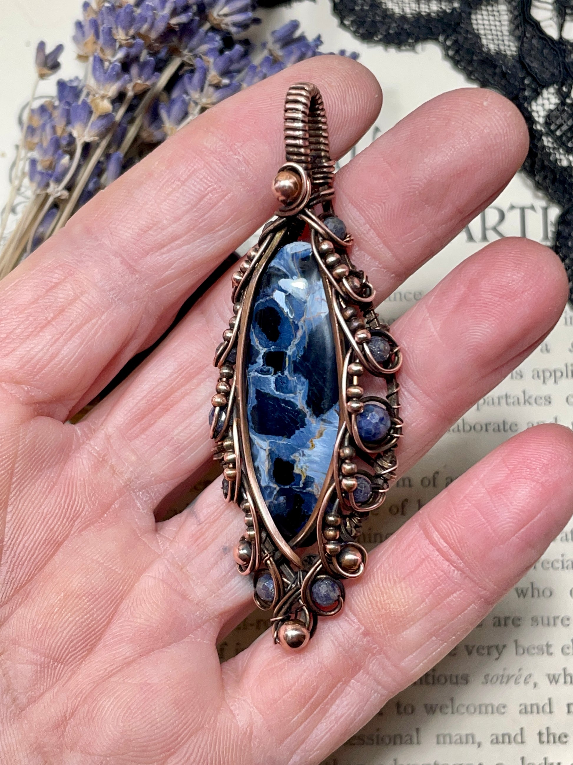 I have hand cut and wrapped this beautiful Pietersite cabochon in bare Copper wire and added some copper and faceted sapphire beads.