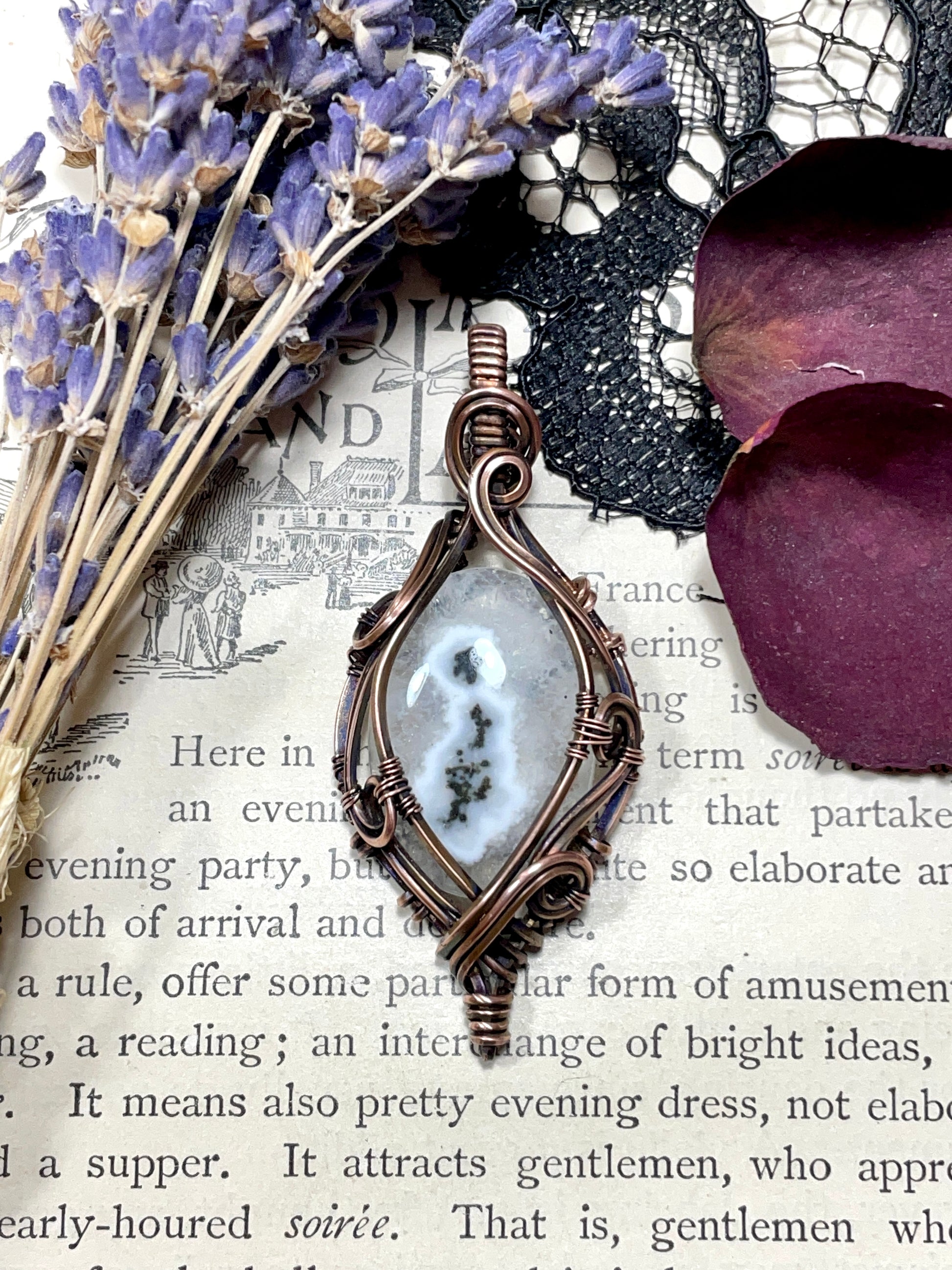 I have wrapped this beautiful Victorian inspired Solar Quartz stalactite piece in bare hammered copper wire with flowing beaded accents. This piece was then antiqued and hand polished it to give it a beautiful antique finish.