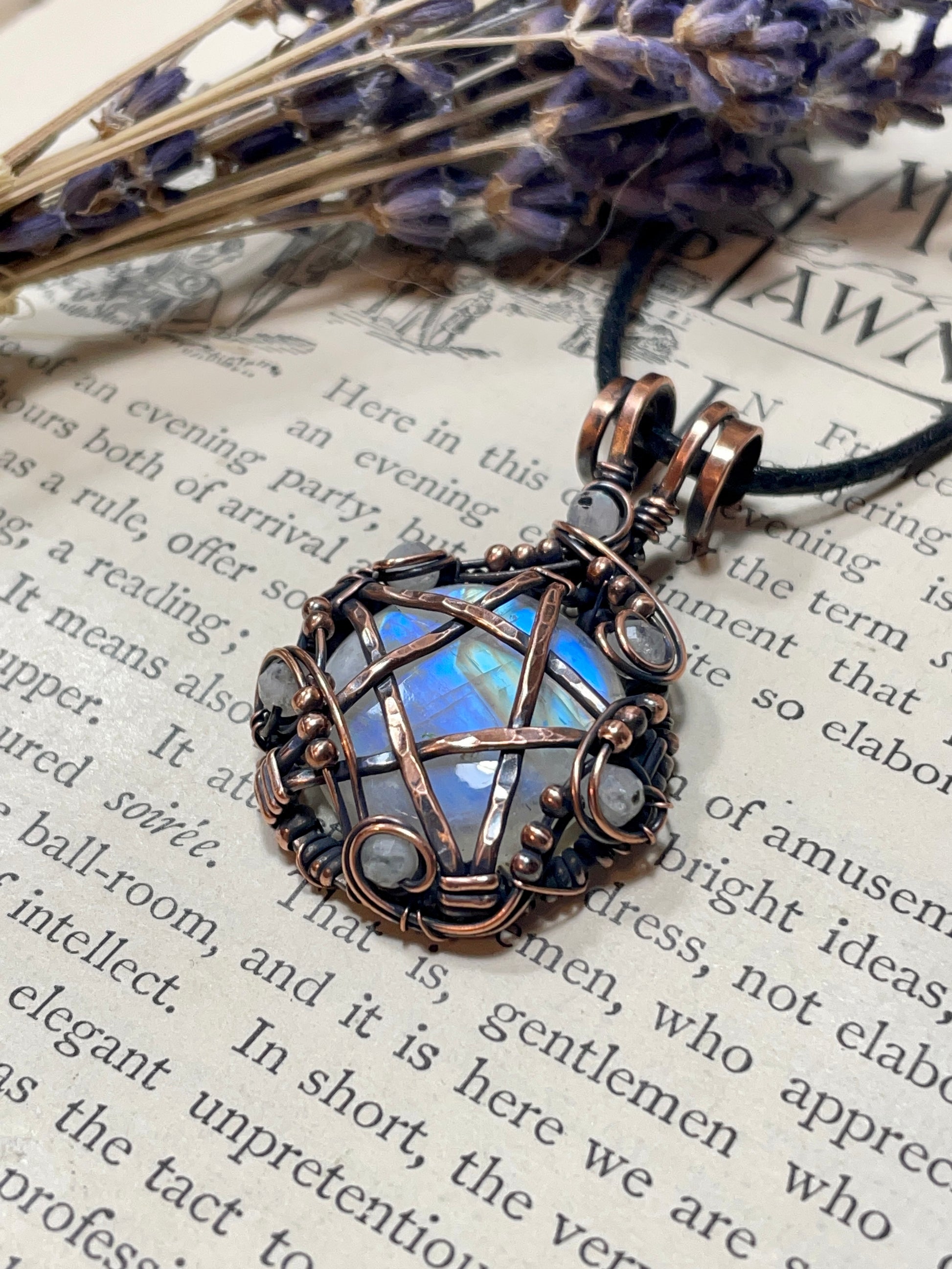Moonstone (Rainbow Moonstone) Pentacle Pendant in Copper