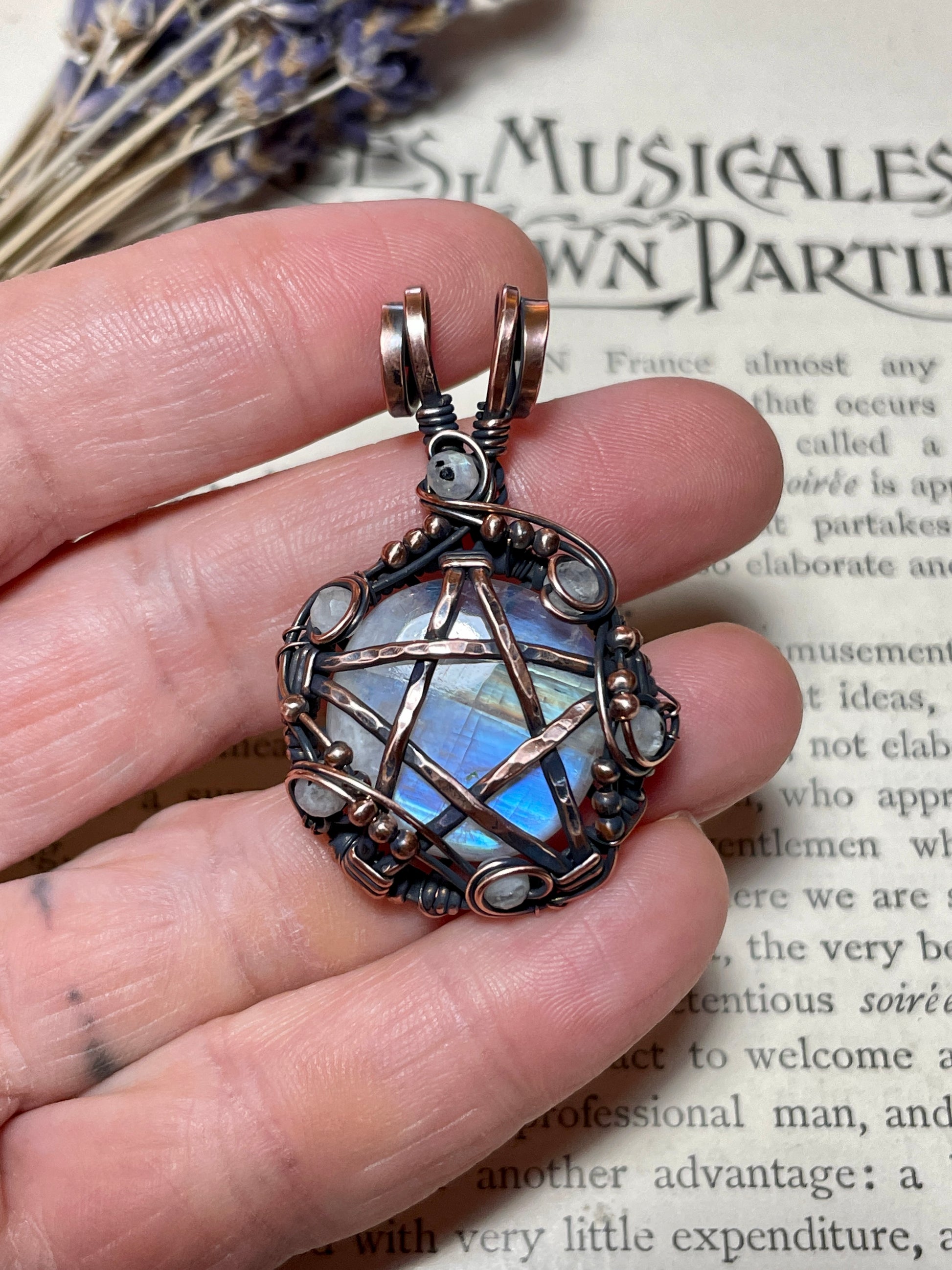 I have wrapped this Rainbow Moonstone (Moonstone Gems) in hammered bare copper with added copper beads and faceted Rainbow Moonstone bead embellishments.