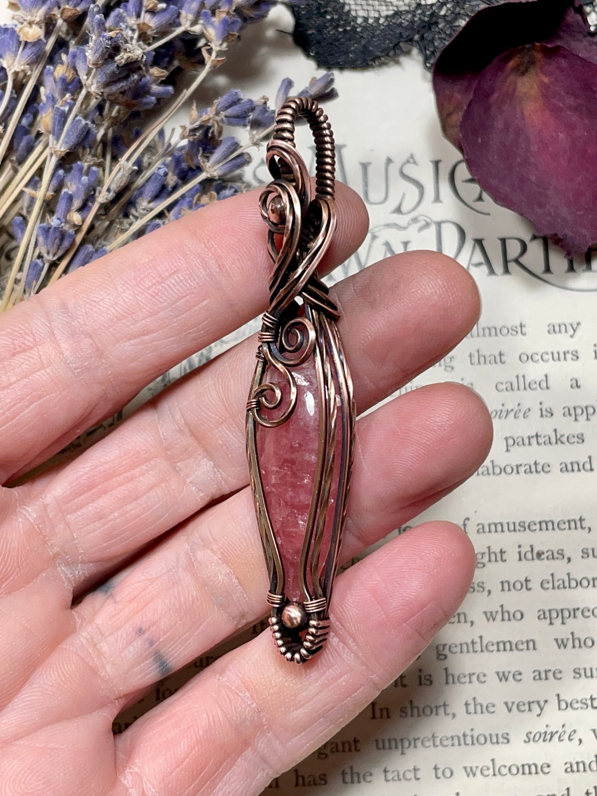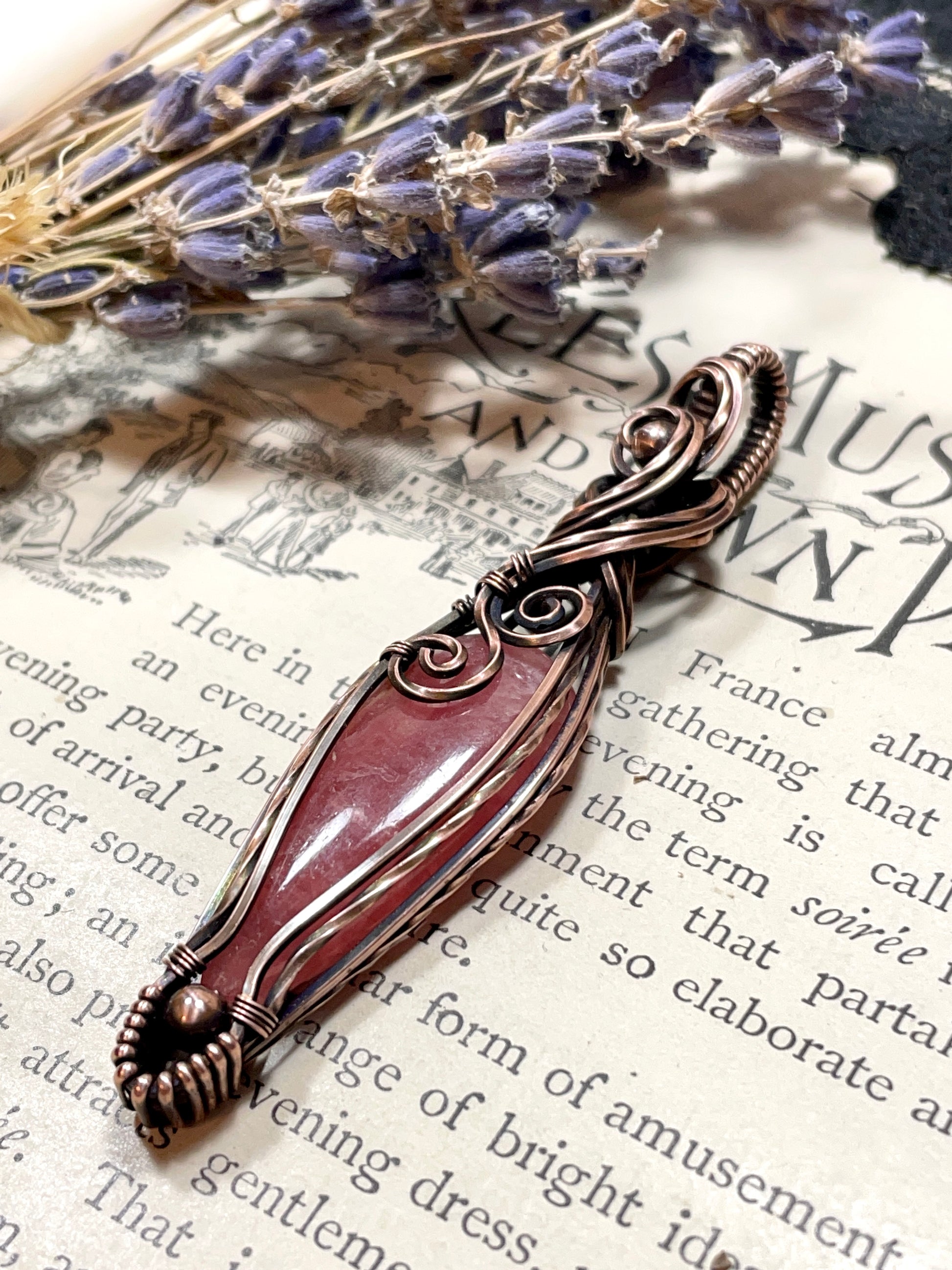 I have hand cut and wrapped this beautiful Rhodochrosite cabochon in bare Copper wire.