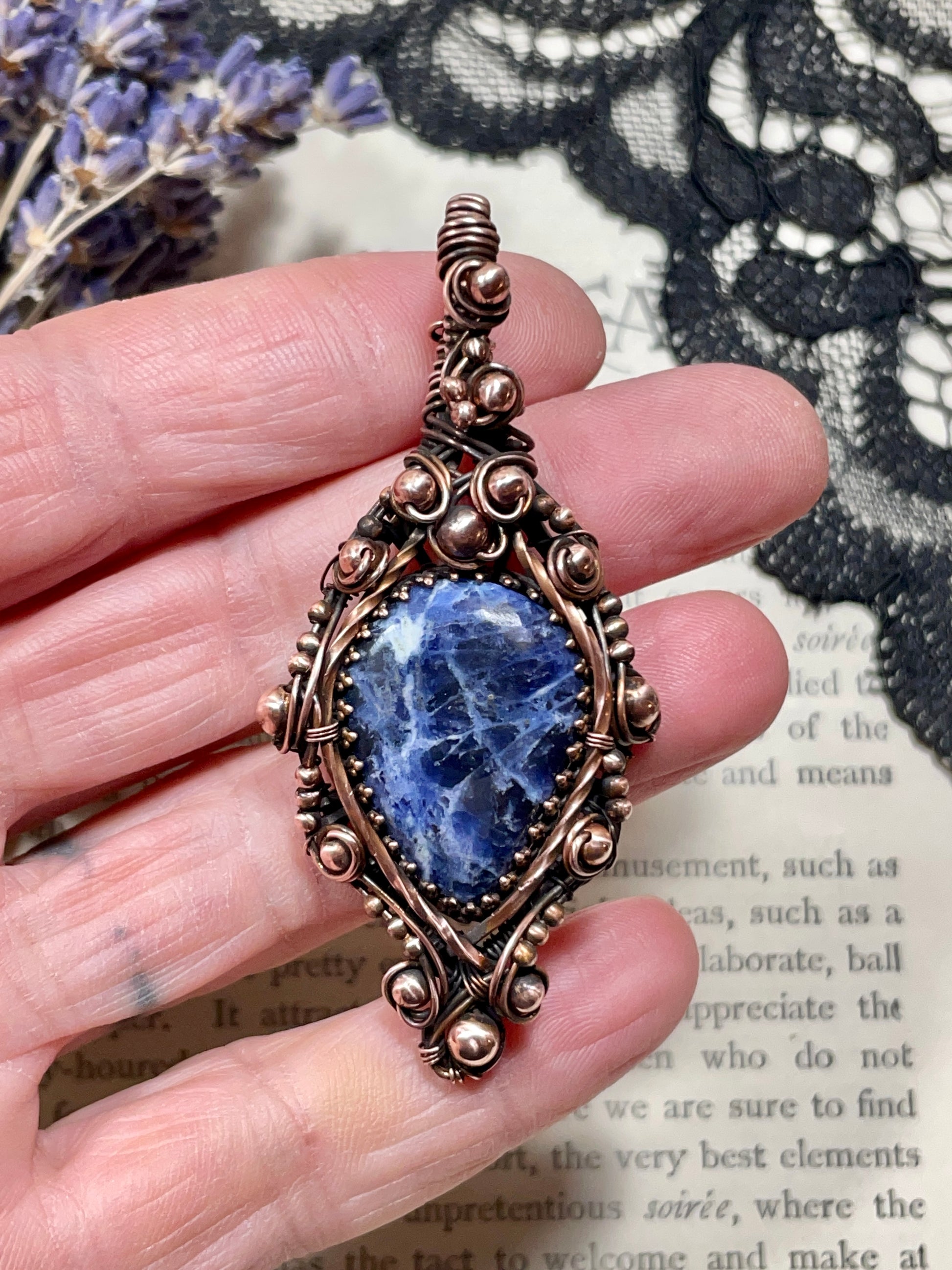 I have hand cut and wrapped this stunning Ontario Sodalite Cabochon in hammered and woven bare copper. It has been bezel set in copper gallery wire and has been embellished with copper beads.